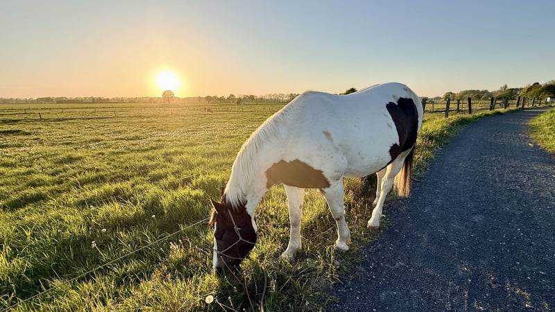 „BumbleBee“ to 13-letni, piękny Pinto / Paint z widocznym scheckem, którego zakupiliśmy pod koniec 2024 roku jako końka dla początkujących, już lekko wyczesanego do dalszej nauki jazdy. Pod siodłem jednak okazuje się niechętny na nacisk łydki, zamyka się i rezygnuje z jakiejkolwiek współpracy. Następnie mogą pojawić się próby gryzienia i ewentualnie kopanie. Przypuszczalnie BumbleBee w swojej przeszłości musiał doświadczyć bardzo złych przeżyć, o których nie poinformowano nas przy zakupie. Według fachowej oceny, takie zachowanie jest możliwe do opanowania tylko przez doświadczonego specjalistę na dłuższą metę. Dlatego BumbleBee jest wyraźnie oferowany jako koń nie do jazdy. BumbleBee został od podstaw wytrenowany na ziemi zgodnie z metodą pro-ride horsemanship Thomasa Güntera i odpowiednio zsocjalizowany. Zna pracę na lonży oraz woltyżerkę. Jest ciekawski i odważny. Dlatego chętnie i zrelaksowany spędza czas na wycieczkach terenowych. Zasadniczo BumbleBee to bardzo przyjazny, sympatyczny i uprzejmy koń rekreacyjny z dużym sercem, który chętnie pracuje na ziemi. Jest przy tym bardzo spokojny i niezawodny w terenie, na ziemi. BumbleBee jest końcem o niskim hierarchicznym statusie, przyjaznym i ciekawym wobec swoich rówieśników. Obecnie stoi w boksie z dostępem do paddocku na zewnątrz, zna też stajnię otwartą. Wysokość w kłębie około 1,58 m. Posiada hiszpański paszport equiden, był regularnie szczepiony (grypa, herpes, tężec), odrobaczany i co 4 tygodnie jest prezentowany u podkuwacza; jest całkowicie spokojny przy podkuwaniu. Ostatnia kontrola zębów miała miejsce w listopadzie 2025 roku. Zawsze przyjmuje lekarza w sposób spokojny. W ciągu roku czasami ma sezonowe problemy oddechowe z kaszlem (w sezonie pyłowym), dlatego u nas dostaje nawadniane siano. Obecnie jest zdrowy i bez dolegliwości. Poszukujemy dla BumbleBee nowego, pełnego miłości domu, w którym będzie można cieszyć się pracą na ziemi lub służyć jako koń towarzyszący, lub spędzać czas na spacerach z właścicielem na zewnątrz.