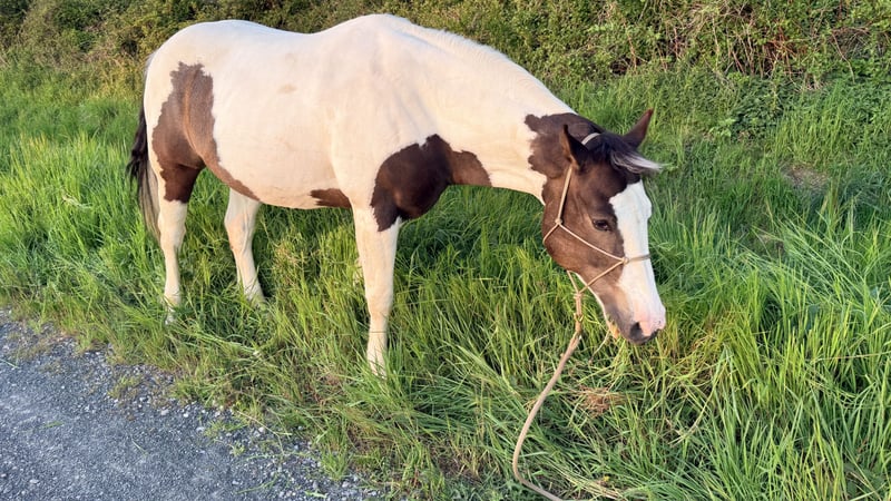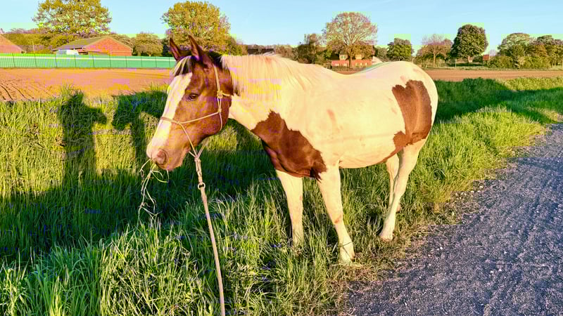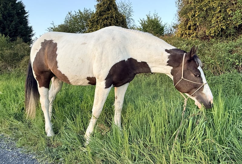 „BumbleBee“ is a 13-year-old handsome Pinto / Paint Pinto with a piebald coat, purchased by us at the end of 2024 as a backed beginner horse for further training. However, under saddle, he now shows resistance to leg pressure, becomes uncooperative, and withdraws from any cooperation. This is followed by biting attempts and, in some cases, bucking. It is likely that BumbleBee has unfortunately had very negative experiences in his past, which were not disclosed to us at the time of purchase. According to professional assessment, this behavior can only be managed long-term by an experienced trainer. Therefore, BumbleBee is explicitly offered as not suitable for riding. BumbleBee has been ground-trained and desensitized by us following pro-ride horsemanship principles by Thomas Günter. He is familiar with work on the longe line as well as free work. He is curious and fearless. Accordingly, he also enjoys relaxed rides in the countryside. In principle, BumbleBee is a very personable, kind, and friendly leisure partner with a big heart who enjoys groundwork. He is very uncomplicated in his dealings. He is a reliable companion in the field; on the ground. BumbleBee is a lower-ranking horse and friendly and curious towards his herd mates. Currently, he is housed in a box with an outdoor paddock, but he is also familiar with a pasture with a herd. BumbleBee stands approximately 1.58 meters tall. He has a Spanish equine passport, has been regularly vaccinated (influenza, herpes, tetanus), dewormed, and is presented to the hoof orthopedist every 4 weeks as a barefoot horse; he is absolutely shod-free. An annual dental check-up (most recently in November 2025) has also been carried out. He always receives the veterinarian calmly. During pollen season, he temporarily experiences respiratory issues with coughing and is fed soaked hay. Currently, he is free of any complaints. We are looking for a new, loving home for BumbleBee where there is joy in groundwork, or where he can serve as a companion horse or be out and about on foot with his person.