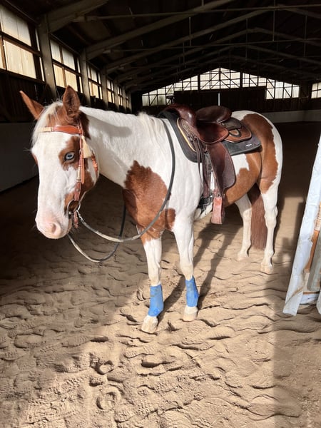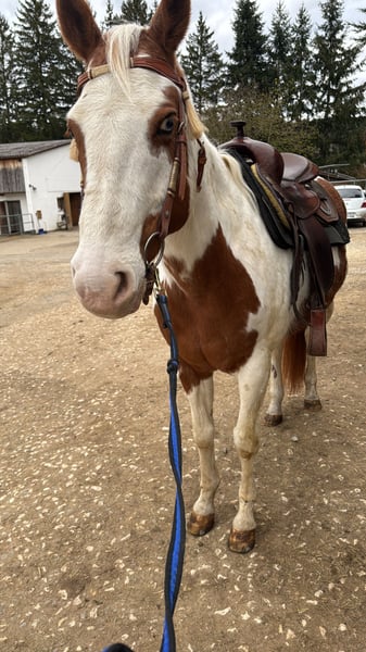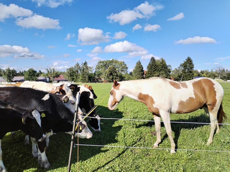 Nach langem überlegen gebe ich aus privatlichen Gründen meinen 14 jährigen Paintmix Wallach in gute Hände ab. Er ist wirklich ein lieber Schatz und sehr menschenbezogen er macht alles mit. Er hat ein Stockmaß von 1.50 cm und wird westernfreizeit geritten. Leider habe ich ihn die letzte Zeit nicht mehr so geritten deshalb müsste man das alles wieder antrainieren aber das ist alles kein Problem bei ihm. Beim angaloppieren macht er immer wieder gerne einen Freudensprung deshalb nicht für Anfänger geeignet. Beim ausreiten geht er gut in der Gruppe alleine muss man kosiquenz sein aber dann funktioniert es alles perfekt. Kennt Halle Platz und Roundpen. In der Herde ist er sehr rangniedrig geht jedem Streit aus dem Weg. Derzeit lebt er im Offenstall mit 24/7 Heu kennt aber auch Box mit täglichem Weidegang. Er hat alle seine Impfungen, entwurmungen und geht regelmäßig zum Hufschmied. Leider besitzt er ein Handicap und zwar hat er eine Zyste im Strahlbein deswegen hat er vorne duplos drauf da kommt er sehr gut zurecht. Wenn er zu arg belastet wird tickt er vorne. Bei ernsthaftem interesse freue ich mich auf Antworten. Zubehör kann mit erworben werden