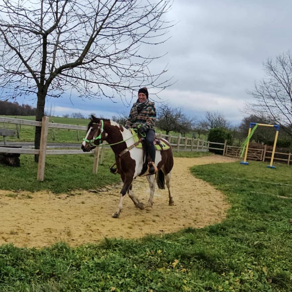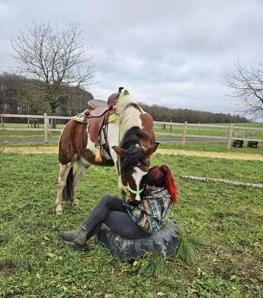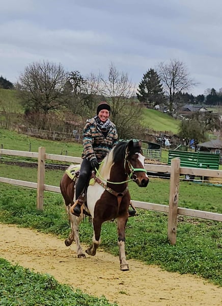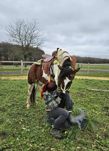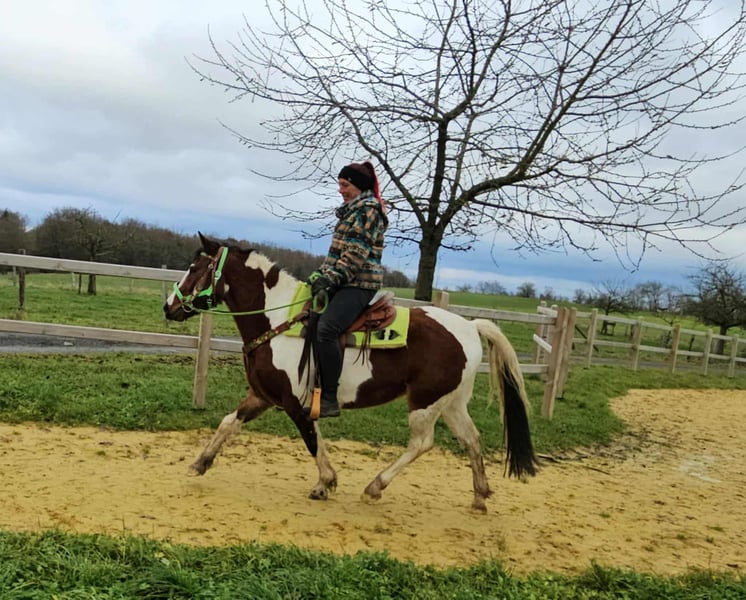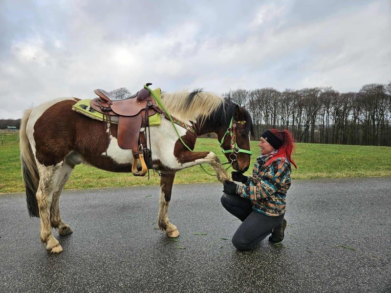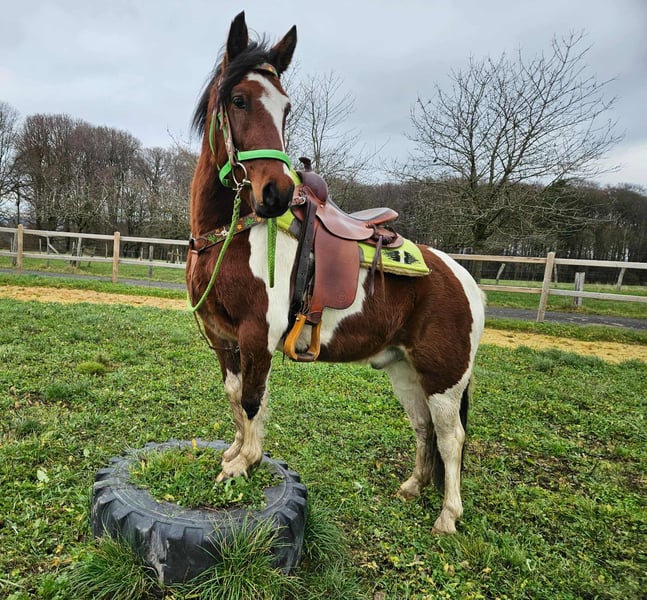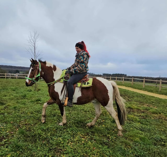 Scheck gelding "Ben" – gentle, calm, and versatile Age: 3.5 years Height: approximately 14.3 hh Price: €4,900 AKU: available ✨ Description: Ben is a charming, friendly piebald gelding who immediately captivates with his calm demeanor and pleasant nature. He is absolutely well-behaved in handling, very people-oriented, and, despite his young age, already impressively balanced and relaxed. Under saddle, he proves to be cooperative, eager to learn, and reliable – a young gelding that enjoys working and being with people. His kind nature makes him an ideal partner for families and leisure riders. Perfect for: Riders looking for an uncomplicated, friendly, and dependable leisure horse. Also well-suited for teenagers or smaller adult riders. Our horses are regularly: – dewormed – attended to by the farrier – osteopathically checked Farm shop: Western saddles, bridles & accessories Transport and equipment can be organized affordably upon request Our service: ✅ 3-month exchange guarantee ✅ Trial ride: €35, each additional horse €25 (credited if purchased on the same day) ✅ €100 immediate discount for pickup/transport on the same day ✅ Personal and honest advice Please inquire exclusively by phone: 0171 – 4001968 Available daily from 8 a.m. to 8 p.m. ⚠️ No emails or WhatsApp messages ⚠️ All information provided without guarantee