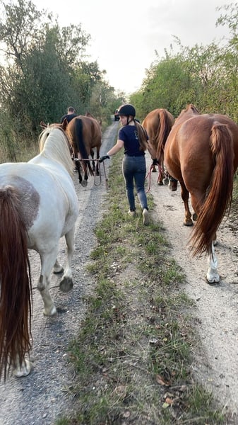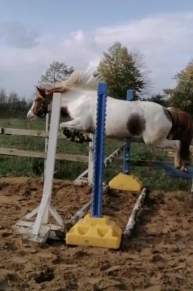 Hello, I am Pauline Blue Eyes, but you can call me Xanti. I am a Pinto mare, approximately 1.33 m tall, born in 2015, making me 10 years old, and I have a chestnut coat with white markings. I am familiar with being in a box, but I currently live in a mixed herd in a paddock, and I would prefer to stay that way. I get along fine with Shetlands or larger horses; I am rather low in the hierarchy and adapt to any situation. I am looking for my person, someone with time and patience for me. Sometimes I can be a typical pony with a stubborn streak and prefer to do my own thing. On other days, I am very sweet and allow myself to be lunged and ridden at the walk, trot, and canter. I generally enjoy jumping. Since my current family has little time for me and I really need regular training, with assertiveness yet a lot of calm and love, they have made the difficult decision to find a new, experienced home for me where I can receive the attention I seek and need. The farrier is no problem for me (barefoot), I enjoy being groomed, and I willingly go into the trailer. Here, I have hay 24 hours a day and pasture in the summer. Leading along the road, tractors, trucks, and motorcycles are not an issue for me. Generally, I am quite fearless and go in and through everything. Therefore, I also need a securely fenced paddock and a pasture with electric fencing. That should generally be the case, but I prefer to mention it again. For further questions, please feel free to contact my family at 0172 53 63 327. I look forward to meeting you!