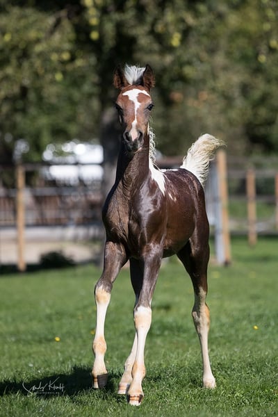 Pintabian foal with expressive, flowing movements and excellent conformation. Ideal for breeding and leisure riding. Tobiano brown and white pinto. Gentle and easy to handle.