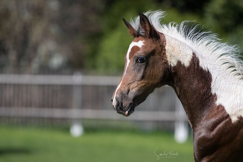 Pintabian Fohlen mit raumgreifenden Bewegungen und vorzüglichem Ausdruck. Ideal für Zucht und Freizeit Tobiano Braunschecke Lieb im Umgang