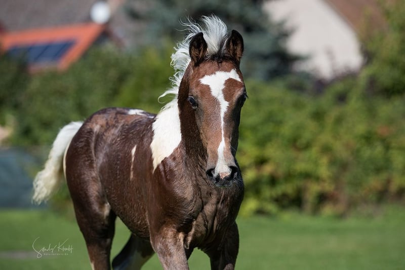 Pintabian veulen met ruime bewegingen en voortreffelijke uitstraling. Ideaal voor fokkerij en recreatie. Tobiano bruinbonte. Lief in de omgang.
