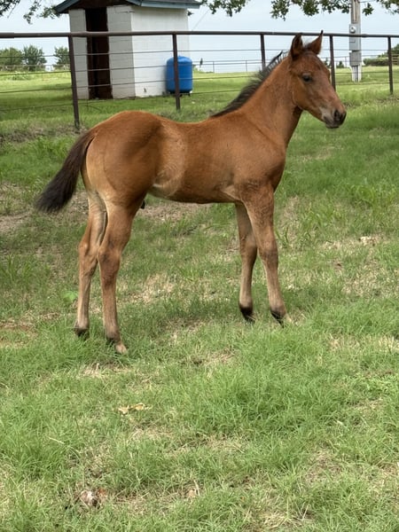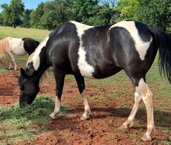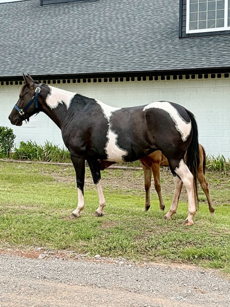 "AVAILABLE ON ONLINE HORSE AUCTION AT www DOT MagicHorseAuction DOT com BIDDING OPEN NOW thru TUESDAY | JULY 22nd - BUY IT NOW AVAILABLE! *Final price will be determined on auction site* CONSIGNOR CONTACT INFO: JDT Ranch 572-205-5282 LOCATION: Crescent, OK "Wow!!! What a picture perfect 3 in one package!!!! All the opportunity is right here!!! Jewels is a 6 yr old registered pinto that is as bomb proof and youth suitable as they come!! And not to mention drop dead gorgeous! She has a strapping line back dun stud colt on her side and she has been exposed to a registered black and white gypsy stallion! We truly are proud to offer his gorgeous package to the public not only is there so much opportunity in one purchase! Jewels is absolutely a joy to ride! She hasn’t been ridden in a year due to her being bred and just watch her video! She rides off in a halter like she hasn’t missed one day! In the past jewels was a barrel and pole youth horse! She knows all playday events and has also been ranched on extensively ! Pushed cattle crosses water and loves going on overnight trail rides! Stands perfect for the farrier, is current on teeth and vaccinations! She is truly a unicorn and will take care of absolutely anyone!!! Her big shapey line back dun stud colt on her side is an absolute crackerjack of a colt! He is kind and gentle with a big pretty eye Great bone and huge foot His sire is a registered bay roan quarter horse (driftwood x king fritz ) and is an outstanding ranch /rope/barrel horse. Delta as we call him is current on worming and vaccinated he will be halter broke when he leaves the ranch he has been exposed to every aspect of ranch life and nothing phases him will absolutely make someone a perfect partner! Truly top prospect! Jewel has been exposed back to a registered gypsy stallion the resulting foal will be able to be registered in the Gypsy association registration paperwork will be sent along with all records for resulting foal! This next baby is guaranteed to have bone feather and hair galore in a fancy black and white package ! Located in Guthrie Oklahoma shipping can be arranged anywhere please call Megan 572-205-5282 with any questions
