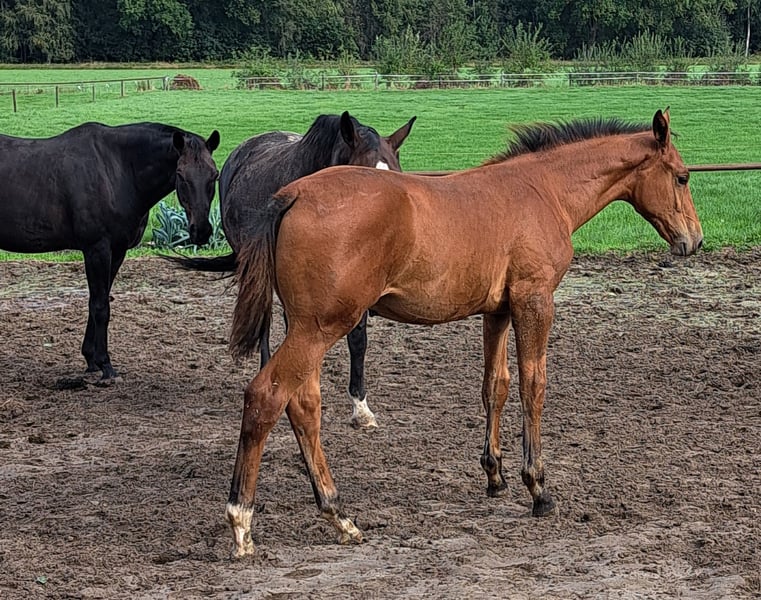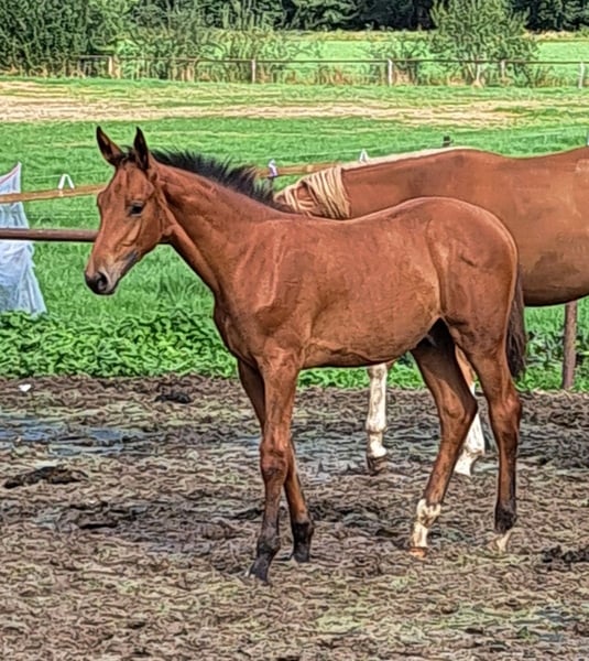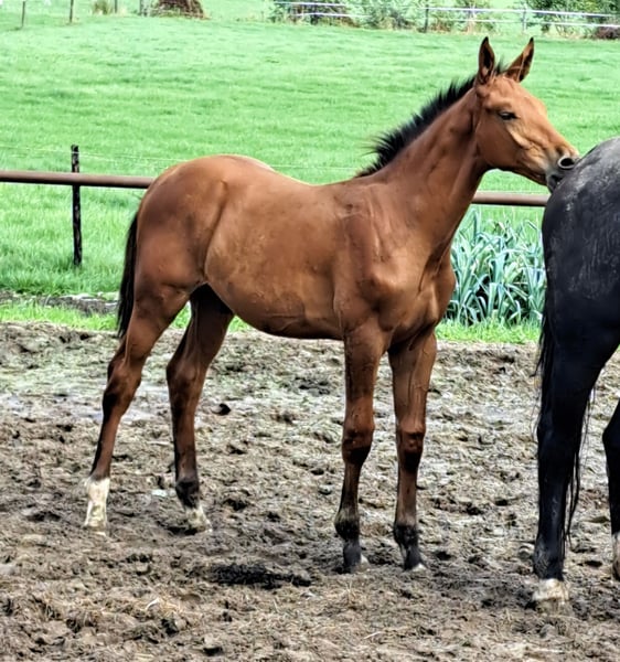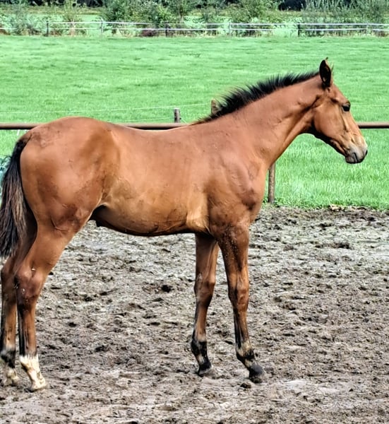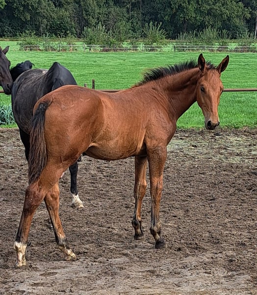 For sale colt foal. Born 15-05-2025. Color brown with 2 white socks at the back and 1 white coronet at the front. Moves well and has a good jump. MM 1.30 jumping MMM 1.45 jumping From the direct maternal line of Spender S Holsteiner line 3116