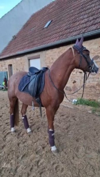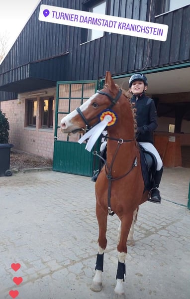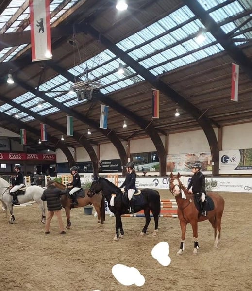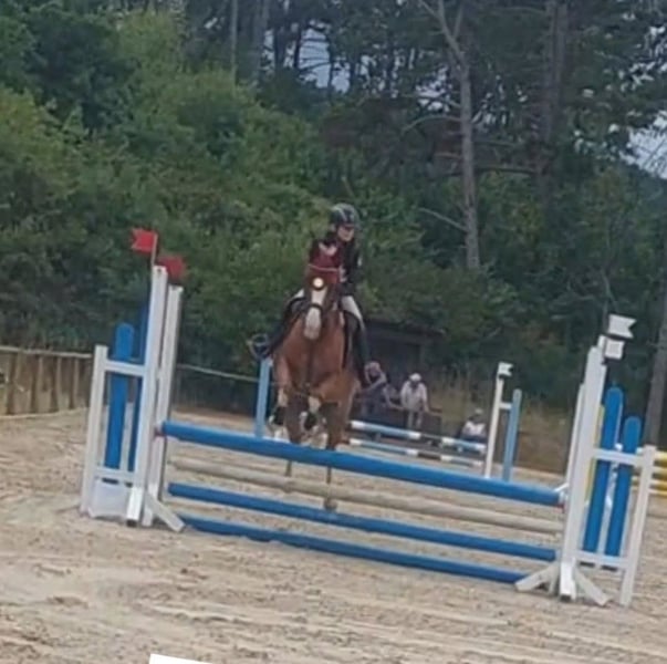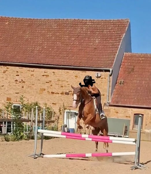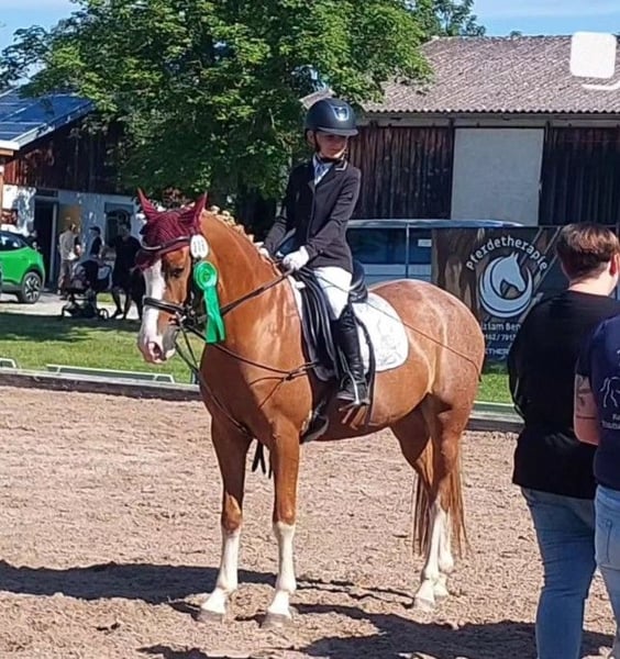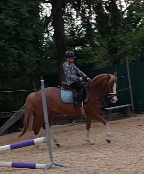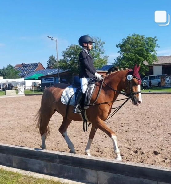 Elegant Dutch Riding Pony mare for sale – perfect for show jumping enthusiasts or beginners We are offering a beautiful chestnut mare, four high white stockings, born in 2016, with a height of 14.8 hh. A reliable partner for jumping up to 80 cm. She has never refused at a competition. She confidently handles unfamiliar cross-country jumps, is fearless, and assists the rider when needed. However, she is quite energetic in the arena, making her suitable for children or youth with a soft hand, as she always wants to jump. She is easy to handle even for the smallest riders. She loads calmly onto the trailer and is barefoot, making her suitable for grass arenas and trail rides as well. Unfortunately, she is somewhat wary of other horses and does not get along with two of my other mares, which is why she stays in a box at night and on a paddock during the day instead of in a herd. In dressage, there is room for improvement, but she also suits experienced adult riders well, so a confident rider can comfortably ride her. A fantastic horse for ambitious riders seeking a reliable partner for leisure riding or as an introduction to show jumping! Please contact me via WhatsApp at 01704696745. Text messages only, as the reception for calls is poor! Videos available on Rimondo under "Lianne 7" or on Instagram "reiterhofkempf" – Highlights: "Anne"