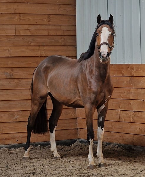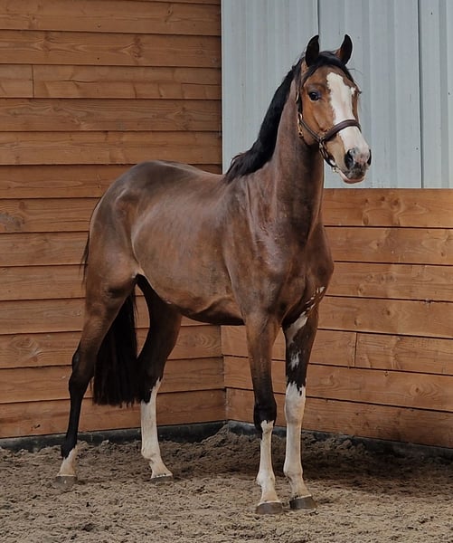 Yegua de salto de 3 años, espectacular Procedencia: Krem's Perfect Choice x Burggraaf x Ramiro x Joost Esta yegua nació el 31 de marzo de 2023 y mide aproximadamente 1,60 m de alzada. Es oficialmente criada para salto, pero tiene un movimiento por encima de la media. Una magnífica yegua polivalente. Una yegua muy elegante, con patas blancas largas y manchas blancas entre las patas delanteras y debajo del vientre. Ha sido sometida a radiografías, incluyendo cuello y espalda. Yegua de carácter amigable, aún sin ser montada. Para más información, por favor llame o envíe WhatsApp al 0613704472.