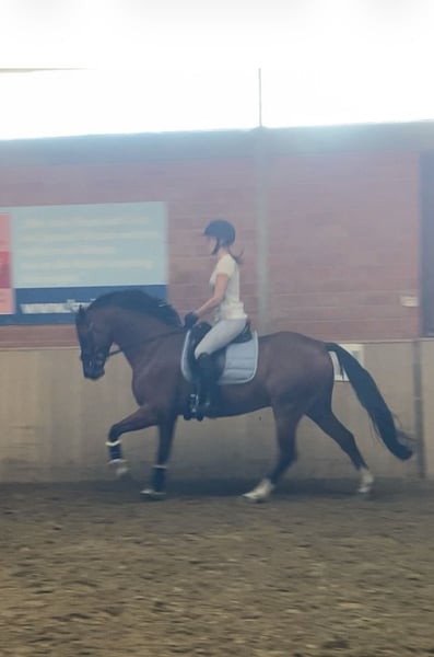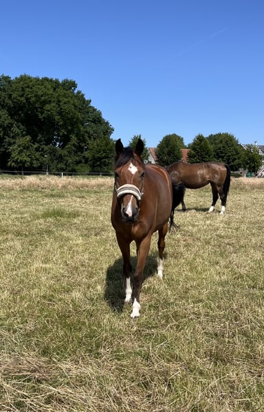 A charming brown gelding born in 2015 is available for sale. With a height of 14.9 hh, he is especially suitable for young riders or small adults seeking a delightful leisure pony. He has a friendly demeanor, is well-trained, and offers a pleasant riding experience. He enjoys jumping, walks calmly in the arena and with side reins. He is also familiar with lunging for beginner riders and can be ridden without a saddle. Group rides have been occasional. He is less suitable for nervous riders or as a dedicated children's pony, as he can sometimes startle in unfamiliar situations and may leap forward or to the side. No bucking or rearing, but he occasionally needs a rider who can provide him with confidence. In the indoor arena, he requires some distance from approaching horses. He has not been shown at competitions and is offered solely as a leisure pony. Please feel free to contact me for further information.