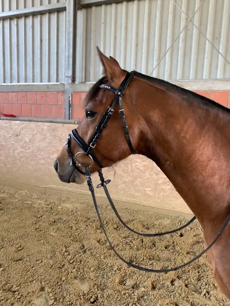 Zum Verkauf steht ein hübscher brauner Wallach, geboren im Jahr 2015. Mit einem Stockmaß von 149 cm eignet er sich besonders für Jugendliche oder kleine Erwachsene, die ein charmantes Freizeitpony suchen. Er zeigt ein freundliches Wesen, ist gut ausgebildet und lässt sich angenehm reiten. Er hat Freude am Springen, läuft brav in der Abteilung und mit Ausbindern. Ebenso kennt er Reitanfänger an der Longe und lässt sich auch ohne Sattel reiten. Ausritte wurden bisher nur gelegentlich in der Gruppe gemacht. Für ängstliche Reiter oder als reines Kinderpony ist er weniger geeignet, da er sich in ungewohnten Situationen schon mal erschreckt und dabei einen Satz nach vorne oder zur Seite machen kann. Kein Bocken oder steigen, aber er benötigt zwischendurch einen Reiter, der ihm Sicherheit vermittelt. In der Halle benötigt er etwas Abstand bei entgegenkommenden Pferden. Auf Turnieren wurde er nicht vorgestellt und wird als reines Freizeitpony angeboten. Bei Interesse stehe ich gerne für weitere Informationen zur Verfügung.