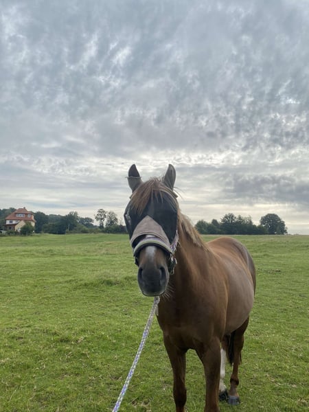 With a heavy heart, I have decided to sell my 13-year-old riding pony gelding. Birmingham, affectionately called Buky, covers very well despite his relatively small height of 143 cm. He is therefore ideally suited for smaller to medium-sized riders or children and teenagers up to 160/165 cm. After being licensed at the age of three, Buky was turned out and has progressed through lessons up to L level, competing successfully at A level in competitions. Buky proves to be an absolutely reliable all-round pony in handling. Under saddle, he always tries to show his best side and shows great interest in learning new movements. Currently, he is riding comfortably at A level. He also enjoys hacking out, whether in a group or alone. In the field, he confidently leads the way and remains unshaken. He enjoys being groomed and loves cuddling. He is easy to handle with different people and always approachable. At present, Buky is kept outside without a rug and is accustomed to being housed with other horses. He wears front shoes and shows no issues when shod. Medically, Buky has an old superficial digital flexor tendon injury, which has healed and causes no problems, provided his workload remains within reasonable limits. Unfortunately, Buky is blind in his left eye. For the most part, this does not cause him problems; he occasionally checks his surroundings with a glance to his left when in the field. When riding indoors, he sometimes has difficulty staying on the outer track on the right rein and tends to drift inward. He can also become a bit quicker, but with trust in the rider and good aids, this can be prevented. He does not show any vices such as bucking or similar behaviors. I can easily imagine Buky as a beloved leisure partner in a parent-child team or within a family, or with a smaller adult rider. He is a friendly, reliable companion who is appreciated for his open and trustworthy nature. Together, one can have many adventures and enjoy wonderful moments with Buky. A purchase option with later buy-back rights is available.