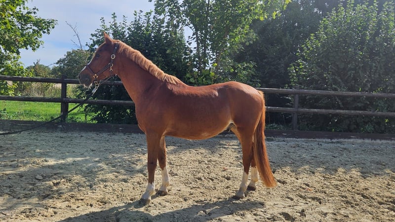Wir müssen uns schweren Herzens von unserem 13-jährigen niederländischen Ponywallach Blitzi trennen. Seit 6 Jahren befindet er sich in unserem Besitz und meine beiden Töchter haben viel mit ihm und von ihm gelernt. Sie lieben ihn sehr, aber auch meine jüngere Tochter wird nun zu groß und der Wechsel zu einem größeren Pony/Kleinpferd ist leider unvermeidlich. Blitzi ist ein sehr hübsches und ansprechendes Pony im „Großperdeformat“ mit tollem Exterieur. Er hat gute Grundgangarten und meine beiden Töchter haben ihn sehr erfolgreich auf Turnieren bis zur Klasse A vorstellt. Sie haben mit ihm mehrere Dressurwettbewerbe und E-Dressuren gewonnen und konnten sich in A-Dressuren gegen Großpferde mehrfach platzieren. Unser Pony liebt es, wenn man sich mit ihm beschäftigt. Auch an Bodenarbeit/ Geschicklichkeitstraining hat er viel Spaß und ist unerschrocken. Er ist in der Arbeit respektvoll, lernt gerne und schnell. Auch im Gelände hat er Freude. Blitzi steht bei uns im Offenstall/ große Paddockbox und kennt im Sommer tagsüber Weidegang. Er benötigt viel frische Luft, so dass Boxenhaltung für ihn nicht in Frage kommt. Im Sommer bekommt er nasses Heu (evtl. ist auch Heulage eine Option). Im Winter bekommt er normales trockenes Heu. Ansonsten ist er gesund und ist sehr verträglich mit anderen Pferden. Er ist brav und leichtrittig. Dennoch muss man sich als Reiter auch durchsetzen können. Er ist robust, regelmäßig entwurmt, geimpft, schmiede- und verladefromm. Wir suchen für ihn ein tolles neues zu Hause, wo er viel draußen sein kann und in einer neuen Familie viel Freude hat. Es besteht auch die Option Sättel mit zu übernehmen. Nur in allerbeste Hände abzugeben.