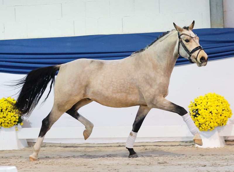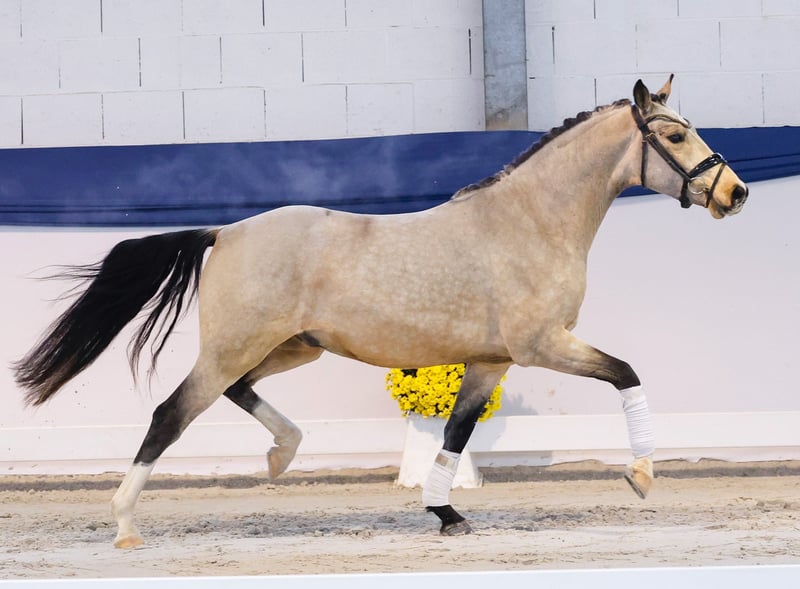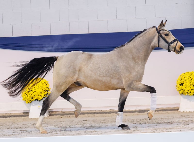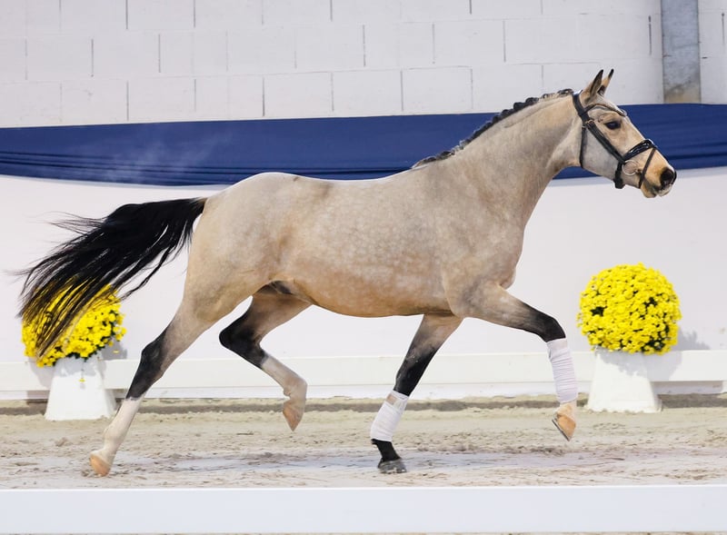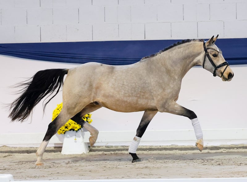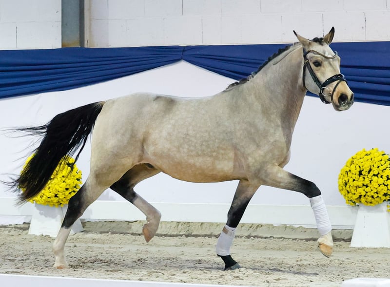 In unserer Kollektion stehen streng selektierte Youngster f�r alle Anspr�che: Ausbildungs-, Zucht- und Kinderponys Hier gelangen Sie zur Gesamtkollektion: https://ponyforum.auction Achtung, Schnuckelhasenalarm! Ein echter Prince Charming ist der dreijährige Buckskin-Wallach Crown Capital. Mit seinem Augenaufschlag wickelt er seine Menschen direkt um den Finger, er hat ein ausgesprochen freundliches und offenes Wesen. Capital bewegt sich mit viel Grundschwung und dem passenden Antrieb aus der Hinterhand, er gibt ein herrliches Seitenbild ab. Obwohl er vom Stockmaß nicht der Größte ist, wird er mit seinem kompakten Fundament seinen Reiter gut abdecken. Er steht sicherlich noch in der körperlichen Entwicklung und wird nun nach der Kastration sicher noch etwas wachsen. Sein Vater DSP Cosmo Royal steht aktuell in der Weltrangliste der Dressurponys immer auf den vorderen Plätzen und seine ersten Nachkommen unter dem Sattel starten erfolgreich im Sport! Direkt vom Züchter.