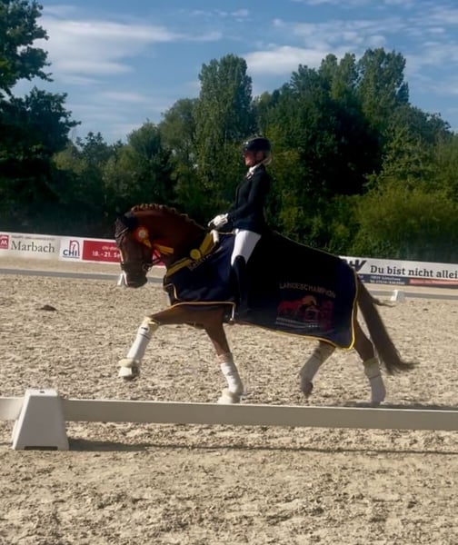 Deze geweldige rijponyhengst is zowel in de omgang als onder het zadel een droom! Met veel beweging en zeer veel rijdbaarheid is hij in de bak echt een blikvanger! Zijn staat van dienst laat geen wensen onvervuld; hij is Landskampioen en Zuid-Duits DSP-kampioen, evenals Bundeschampion van de 3-jarige rijponystuten en -hengsten in 2025. Wie op zoek is naar een betrouwbare rijpony, zal hier een echt juweel vinden! Zeer interessant voor het Bundeschampionat 2026 en zeker later een paard voor de M- en S-klasse!!! Een actuele gezondheidsverklaring met röntgenfoto’s, inclusief de ruggengraat, is aanwezig! Direct van de fokker.