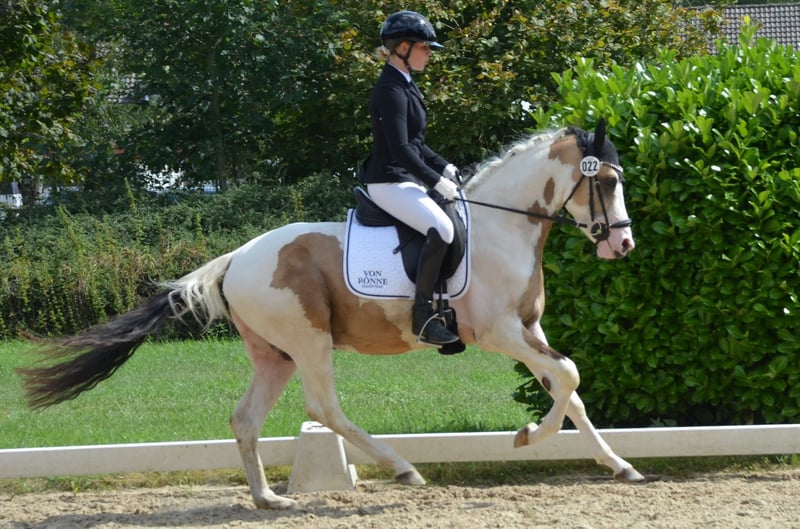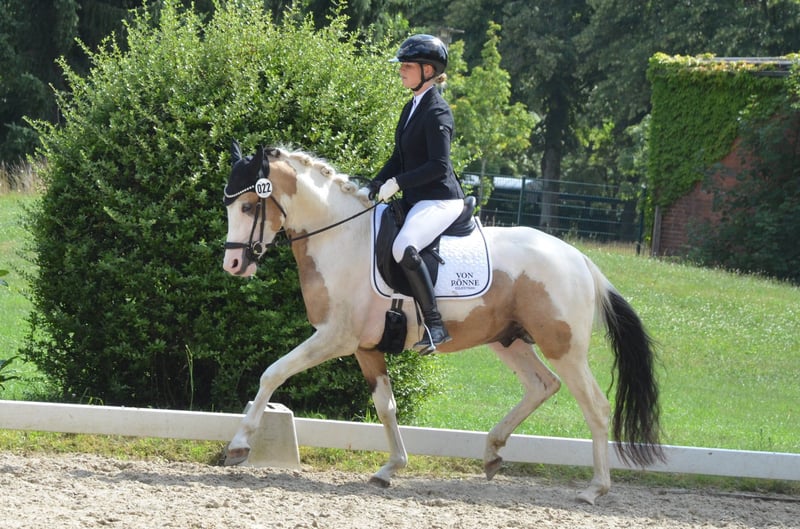 Ce hongre de 3 ans, de couleur buckskin pie, se distingue non seulement par son apparence particulière et ses trois bonnes allures, mais aussi par son caractère aimable et désireux de travailler. Il a été monté avec soin chez nous et s'est toujours montré exemplaire. Lors de sa première sortie en compétition, il a été particulièrement facile et sage. (WN 7,2) Un excellent poney de jeune pour un cavalier sensible. En raison de son âge, ce n'est pas un poney pour débutants/enfants. Il est ferré et habitué au transport. Vermifugé et vacciné régulièrement. Un contrôle radiographique récent sans constatations est disponible - aucune maladie antérieure ou autre. Veuillez appeler pour plus d'informations : +49 162/9232300