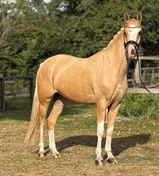 For Sale: German Riding Pony Gelding – Born in 2020, Palomino We are offering a stunning German Riding Pony gelding, born in 2020. With his elegant Palomino coat and a height of 147 cm, he is a real eye-catcher. The pony is ideally suited for dressage and shows great potential for the next levels. He is friendly and well-behaved, eager to learn, and already demonstrates initial dressage movements. Perfect for ambitious riders seeking a reliable and attractive pony. Unfortunately, due to personal reasons, I am no longer able to give him the attention he deserves. It is incredibly difficult for me to part with him, but I believe it is in his best interest. Priority goes to the well-being of the pony over the price. Please feel free to contact me for more information or if you are interested.