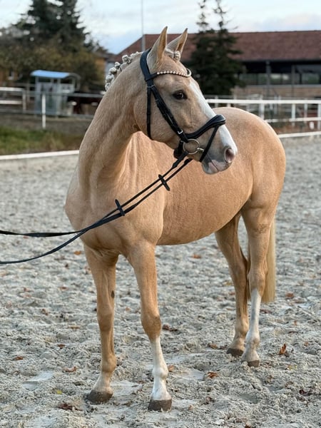 For sale is a very willing and talented Palomino gelding. Goldie impresses every day with his eagerness to work. He is currently in professional training and can be viewed at any time. He is 5 years old, A-certificate qualified, and already mastering basic L-level dressage movements. He is well-behaved in the terrain and enjoys variety. He also handles small jumps, although he has not been further trained in jumping. He is very affectionate with people, loves cuddling, and enjoys the company of his handler. He is friendly and social in his interactions and gets along very well with other horses. In addition to riding, groundwork and handwork have been carried out with him. He is currently barefoot but is also familiar with shoes. He can be ridden by children or teenagers, but should continue to be regularly ridden by an adult due to his age. He shows curiosity towards different surfaces, tarps, a large ball, or even when he slips from behind – all of which do not disturb his calm. He also loves water and happily walks through puddles. Farrier work, loading, and veterinary visits are no problem at all. He measures 1.47 meters at withers.