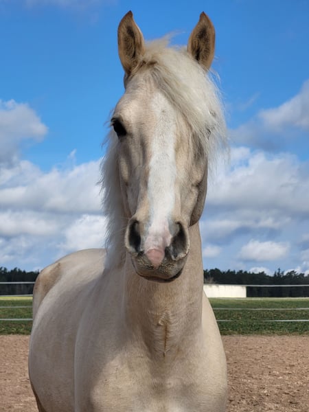 I am unfortunately selling my young stallion stallion because I have to give up equestrian sport due to a knee injury. This gelding impresses not only with his impressive movement combined with looseness but also with his wonderful temperament! Since he has been in my possession, he has never bitten, nipped, or kicked; he is always gentle and not cheeky, even around small children. He enjoys every pet and loves cuddling! His gait is above average, with a relaxed body, powerful push-off, and very expressive movement! When playing with other geldings, it was easy to see that he can sit properly and has a good potential for collection. He also performs well in free jumping and always tries to do everything correctly, although he lacks routine because I hardly have the opportunity to ride him due to my knee injury. He can also be exercised alone or in a group on walks; he remains relaxed when left alone in the paddock or paddock box/stall. He is familiar with both housing systems. He has a very relaxed nature with the necessary energy. He is always well-behaved at the farrier, and the few times we loaded him, he was calm whether alone or with a second horse. He is truly a dream! About a year ago, I sat on him three times and even rode him a short distance in walk; he handled it bravely. I wanted to give him a winter break and continue his training afterward. Unfortunately, I injured my knee badly during that time, and the healing did not go as planned, so he has not been under saddle for a year. Therefore, he is sold strictly as a project horse! He has a small blemish above his eye, which is why I am offering him at a lower price. However, this is only a cosmetic issue and has never bothered him or me; he had it when I bought him. According to the vet, it could be removed if sedated, for example, during a dental check. As I said, neither he nor I have been bothered by it. He is an XXL pony, approximately 153 cm tall, making him suitable for adult riders as well. I wish for someone who will love him dearly and prioritize his well-being! The last photos show his sire and dam. The price is negotiable, as long as it is fair. Please feel free to contact me for further questions.