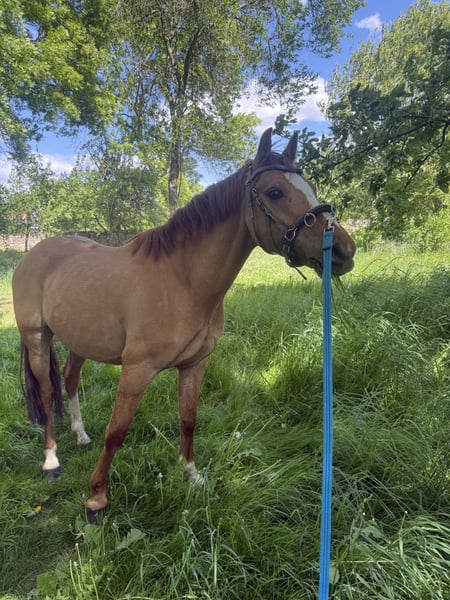 Jeśli wszystko będzie w porządku, z powodu braku czasu muszę rozstać się z moim ukochanym ogierem kucaka rekreacyjnego. Urodził się w 2019 roku i ma około 140 cm wzrostu w kłębie. Kupowałam go jako trzyletniego ogiera od hodowcy, zacząłam go prowadzić i samodzielnie wytrenowałam oraz wyszkoliłam. Jest łagodny w obsłudze, pewnie radzi sobie zarówno na lonży, jak i w terenie solo czy w grupie. Na placu pokazuje ambicje do jazdy klasycznej, które niestety nie mogłam dalej rozwijać z powodu braku czasu. Dzieci mogą go bez problemu prowadzić, czesać i troszczyć się o niego, tak samo podczas czyszczenia kopyt, u kowala czy u weterynarza jest spokojny. Obecnie na przednich nogach ma podkowę, ale nie jest to konieczne. Regularnie odrobacza, a zęby są kontrolowane co jakiś czas. Dotychczas nie wykazywał żadnych niepożądanych zachowań, jednak potrzebuje doświadczonych rąk, ponieważ wymaga pewności siebie. Latem przebywa na pastwisku, zimą w stajni z codziennym wyjściem na pastwisko, co również chciałabym mu zapewnić. Nie ma żadnych znanych urazów ani problemów zdrowotnych. W stadzie jest towarzyski, choć czasami podskakuje na klacz.