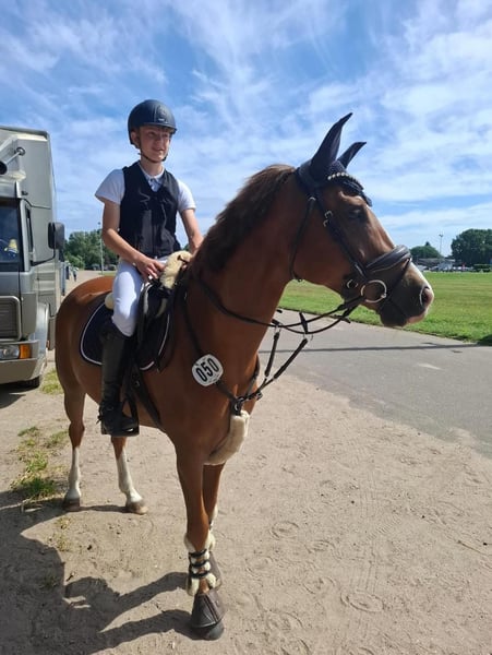 Wałach, 8 lat, 1,48 m Najlepsze pochodzenie skokowe: Bünteeichen Ricardo x Scampolo Ten charakterystyczny wałach poszukuje nowego domu z rodzinnym podejściem. Jest bardzo towarzyski i uwielbia dzieci. Jest wyszkolony w skokach i ma już pierwsze doświadczenia w zawodach. Został zaprezentowany do poziomu A*. Ma 3 wspaniałe chody i jest bardzo przyjemny w jeździe. Dzieci mogą go jeździć bez problemu. Obecnie jeździ na nim mój syn (13 lat), który jednak przechodzi na dużego konia. Dodatkowo jest pod opieką profesjonalnego jeźdźca. Jest bardzo grzeczny u kowala i podczas załadunku. Obecnie ma z przodu 2 podkowy. Jest regularnie szczepiony na zawody, regularnie odwiedza dentystę i kowala, a także jest regularnie kontrolowany osteopatycznie i chiropraktycznie. Aktualny, duży przegląd techniczny, w tym szyja z 7/24, jest dostępny. Brak jakichkolwiek usterek. Jest całkowicie zgodny z innymi końmi, w stadzie jest raczej podporządkowany. Nie ma żadnych problemów z innymi końmi. Na życzenie można przesłać filmy. 0178/1325330 Zapytania proszę kierować przez WhatsApp. Możliwość wypróbowania jazdy. Rozbudowany sprzęt, w tym 2 wysokiej jakości siodła i wędzidła, a także różne koce itp. mogą być zakupione dodatkowo.