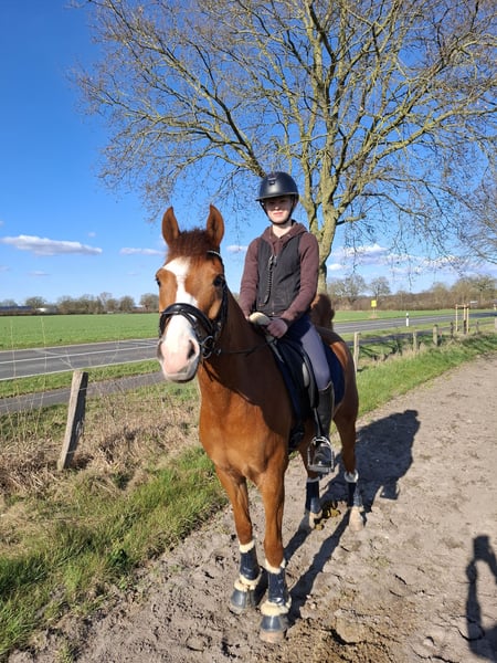 Gelding, 8 years old, 4.9 hh Bünteeichen Ricardo x Scampolo This charismatic pony gelding is looking for a new home with a family environment. He is very people-oriented and loves children. He enjoys jumping and has already gained some competition experience, having been presented up to A* level. He has three excellent gaits and is very pleasant to ride. He can easily be ridden by children as well. Currently, he is ridden by my 13-year-old son, who is now moving on to a larger horse. Additionally, he is receiving professional training. He is very well-behaved at the blacksmith and loading. At the moment, he has front shoes only. He is consistently vaccinated for competition, regularly seen by the dentist and blacksmith, and also undergoes regular osteopathic and chiropractic check-ups. A current, comprehensive health certificate including back check from July 2024 is available. No findings. He is absolutely herd-friendly and tends to be somewhat subordinate in the herd. He has no issues with other horses. Videos can be sent upon request. Contact via WhatsApp is preferred. Test rides are possible. Extensive accessories such as two high-quality saddles and bridles, as well as various blankets, can be purchased additionally.