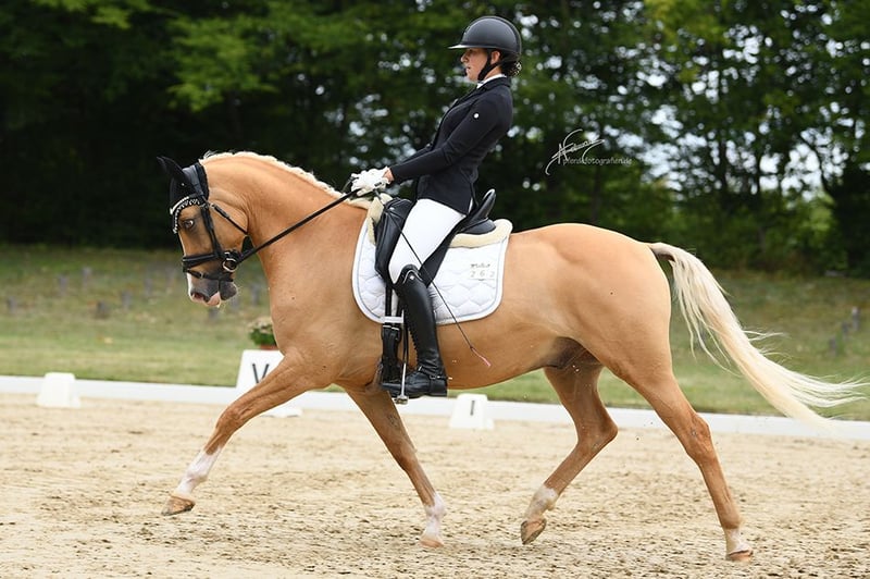With a heavy heart, we are seeking a new home for our beautiful pony gelding. Daily Gold has been with us since he was three years old. Our daughter was 12 at the time and has achieved numerous wins and placings with him, from dressage training level to L** dressage. Last year, they competed in their first Pony FEI event and were immediately placed! He also reliably carries smaller children through competitions. At 8 years old, he is in the prime age to introduce a child to competitive riding and to continue developing further. Daily knows everything a pony should and is always up for fun! We must admit that our daughter has simply outgrown him, and he is still too young to stop being ridden, so we are now searching for a wonderful new home for him. When we purchased him, he was fully vetted and in perfect health. The current health certificate is available. He has always been healthy with us. He measures 148 cm and is correctly registered as a pony in his passport. A suitable dressage saddle in size S and all accessories can also be purchased.