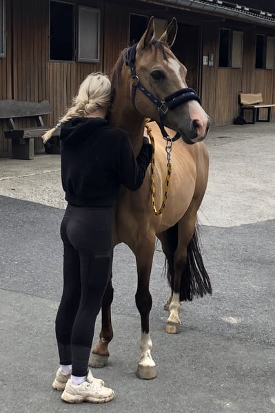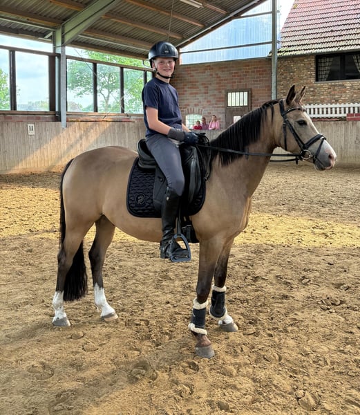 After long consideration, we have reluctantly decided to sell our beautiful 8-year-old riding pony gelding HK Der feine Diamant ("Diddy") by Der feine Lord AT. Our daughter has advanced and educated him a lot over the past years, but after finishing high school, she simply does not have enough time to care for him anymore. Diddy is 1.39m tall, has 3 above-average gaits, and accommodates a small adult very well. He is very comfortable to sit on, loves groundwork and small jumps, and is of course well-behaved for the farrier and loading. He has had little experience with small children, which is why we do not want to offer him as a children's or beginner pony. In handling, he is a real treasure, loves to cuddle, and enjoys being petted. Diddy has also performed very well in clinics. In the video, a 12-year-old boy is sitting on him for the first time, as our daughter is currently not on-site due to a longer internship.