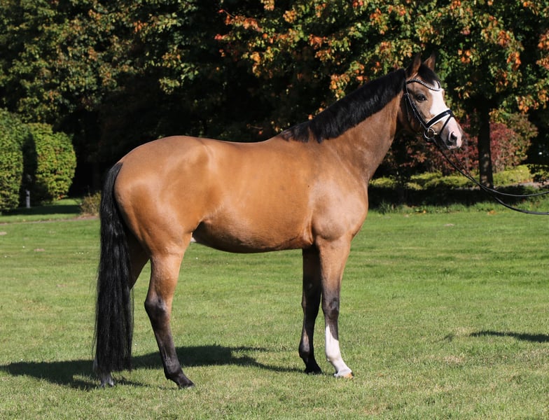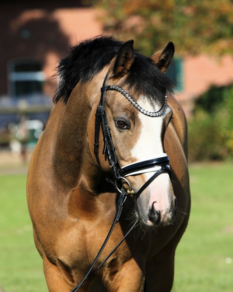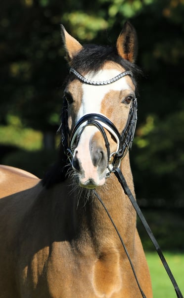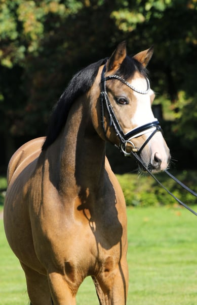 Hier wird schweren Herzens im Auftrag der Familie dieser aufällige bunte Falbwallach zum Verkauf angeboten. Diamond Star war als Junghengst gekört und sogar Prämienhengst,was seine Qualität nochmals unterstreicht. Als junges Pferd war er hoch erfolgreich in Reitpferdeprüfungen,er konnte sich sogar als Finalist auf dem Bundeschampionat platzieren. Weiter von einer Jugendlichen vorgestellt,war er siegreich in Dressurpony A und L und qualifizierte sich nochmals für das Bundeschampionat. Er konnte danach einige Siege und Platzierungen bis zur Klasse L sammeln. Diamond Star ist ein wahrer Lehrmeister, der sich sehr schön reiten lässt und eine enorme Grundqualität mitbringt. Nicht Glotzig oder spannig, ehr ein Pony zum " anschieben". Diamond Star wartet auf seine Famile,wo er neu durchstarten darf. Aktuell klinisch und röngtnologisch O.B. untersucht Weitere aussagekräftige Videos verfügbar, gerne anfragen. Der Wallach deckt gut ab! Auch für einen kleinen Erwachsenen denkbar. Unkompliziert auf Paddock,Weide,Führmaschine und Gelände. Preislich am Ende der angegenenen Kategorie.