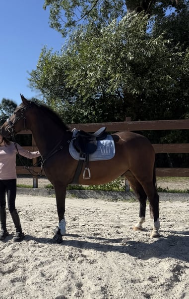 Ze względu na rezygnację z jazdy, oddajemy naszego wspaniałego niemieckiego kucyka sportowego w najlepsze ręce. Ma 148 cm wzrostu i ma 9 lat. Ma złote serce i zasługuje tylko na to, co najlepsze. Jest absolutnie szczery, zawsze łagodny i łatwy w obsłudze. Jego pasją jest skoki przez przeszkody. W tym zakresie jest w 1000% pewny na parkurze i zawsze skacze. Nie znamy jego granicy wysokości, ponieważ nigdy tego nie testowaliśmy. Przenosi jeźdźca niemalże śpiąco. Dopasowuje każde przeszkody do sytuacji. W obcych miejscach jest spokojny i nie wykazuje żadnej niepewności. W ujeżdżeniu oczekuje uczciwego traktowania i spokojnej ręki. Nie ma problemu z wyjazdem na zawody w lonży. Jest pewny siebie do poziomu klasy L, ale potrafi jeszcze kilka lekcji więcej. Sam z łatwością wykonuje wszystkie półstrony. Potrafi również wykonywać skoki z galopu w ramach parkuru. Gdy go wołasz, odpowiada rżeniem i od razu podchodzi. Czeka tylko na swojego człowieka. Załadunek, wyjazdy na zawody, lonża, czyszczenie kopyt – wszystko bez problemu. Przez dwa lata był w mieszanej stadzie w stajni aktywnej, ale obecnie jest znacznie szczęśliwszy w boksie z codziennym wybiegiem. Ma przednie podkowy, ale może również chodzić bez podków. Jest przyjazny wobec każdego konia i raczej zajmuje środkową pozycję w hierarchii. Zęby były regularnie kontrolowane, ostatnio w sierpniu 2025 roku. Posiadamy dokumentację od weterynarza. Regularnie był również leczony fizjoterapeutą. Jest szczepiony co pół roku, a także wykonujemy mu coroczne pełne badanie krwi, aby optymalnie dopasować jego dietę. Na przednich nogach ma po jednym chipie. Zostały one zrentgenowane w wieku 3 i 6 lat i od tego czasu nie zmieniły swojego miejsca, są umieszczone w najprostszych miejscach, co prawdopodobnie zapobiegnie problemom i ułatwi ich ewentualne usunięcie, jeśli zajdzie taka potrzeba. Przy zakupie uwzględniliśmy to i oferujemy go poniżej wartości rynkowej. Zdobył zwycięstwo w konkursach skoków A i jest plasowany w konkursach E i A. Wygrał również konkurs jeździecki dla początkujących. Ponieważ szukamy dla niego idealnego domu, prosimy o krótkie przedstawienie w zapytaniu. Dodatkowo pobieramy 30 € za jazdę próbną, które przy zakupie zostaną odliczone. Wszystkie jego akcesoria (siodła do ujeżdżenia i skoków, ogłowia, derki itp.) mogą zostać dołączone na życzenie i za dodatkową opłatą. Oba siodła są dopasowane przez tapicera do jego potrzeb.