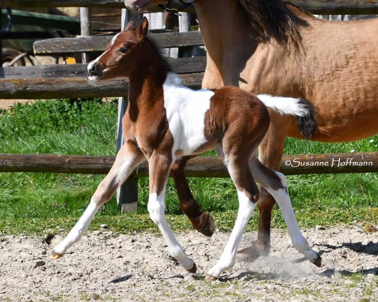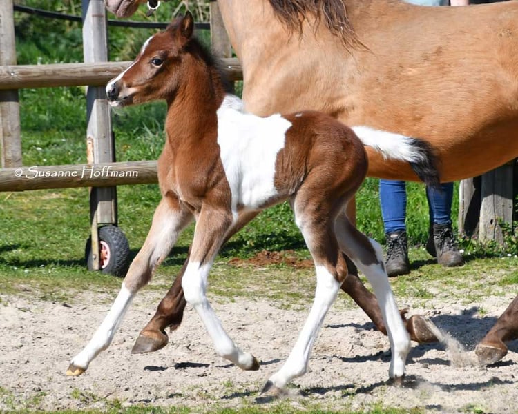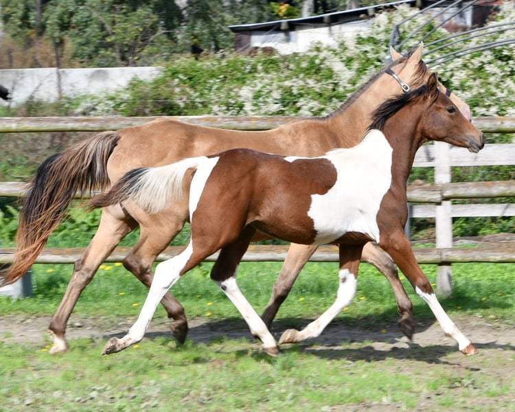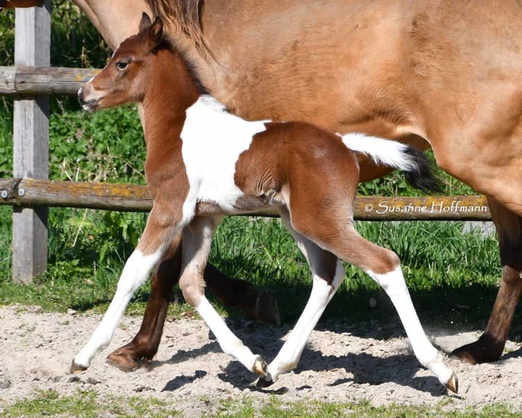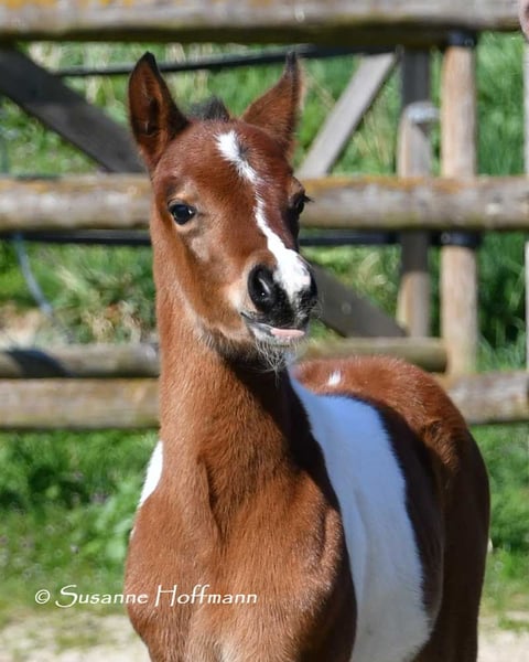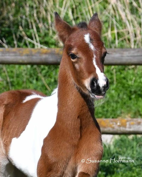 Dieses Hengstfohlen ist nicht nur farblich besonders und auch sonst bildschön sondern charakterlich ein absolutes Traumpferdchen. Menschenbezogen, zutraulich und einfach zu erziehen lässt er wirklich keine Wünsche offen. Seine Mutter ist Prämienstute und sein Vater sogar Leistungshengst und seine 2j. Vollschwester kann auch besichtigt werden. Ein älterer Vollbruder ist sogar gekört. Wobei wir total happy sind wenn der kleine einfach nur Familienpferd wird, egal ob nur Freizeit oder mit sportlichen Ambitionen. Die ersten Fotos sind ganz aktuell von Oktober 2025, danach ist Khaleo beim Musterungstermin zu sehen, dort wurde er hoch prämiert, die nächsten Bilder zeigen ihn wenige Tage alt und die letzten Bilder zeigen Mutter und Vater.