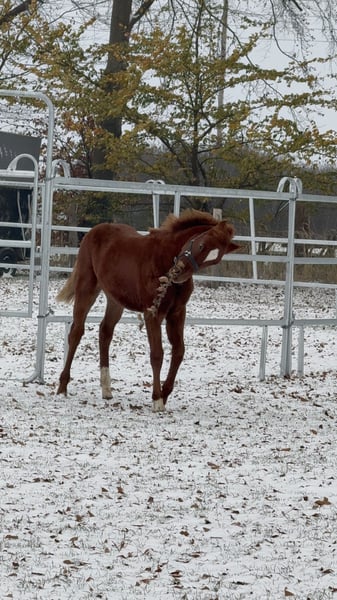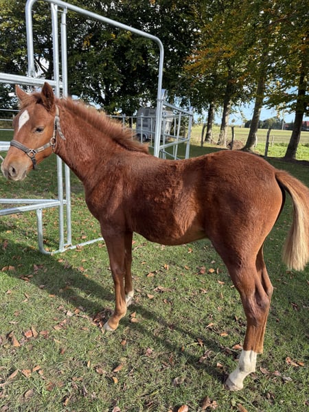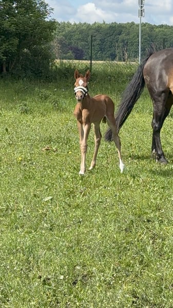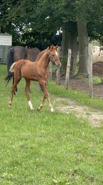 Destino‘s Don‘t worry be Happy, kurz um Happy Dieser wunderschöne, charmante, nervenstarke und Neugierde junge Mann in dunklere Fuchsjacke darf ab sofort ausziehen und seine neuen Besitzer um den Finger wickeln. Er ist absolut Menschen bezogen und kennt alles was ein kleiner Ponymann kennen sollte. Er steht tagsüber mit einem Wallach zusammen und ist Nachts in der Box. Am 19.07.25 waren wir mit ihm in Groß Viegeln, wo er als Elite Fohlen prämiert wurde. Auch für Züchter sehr interessant. Video gerne auf Anfrage. Geboren am 27.05.2025 Abstammung: V.: Elitehengst Destino R MV.: Classic Dancer lll Mutter: 1,47 Vater : 1,47 Wird wahrscheinlich ein wenig größer Winterpreis bis Ende März. Bei weiteren Fragen gerne schreiben