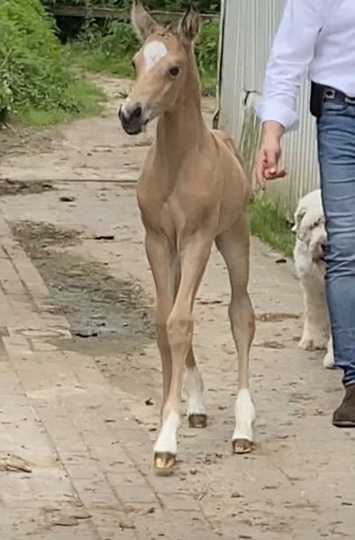 For sale: German Riding Pony colt – Buckskin, born 2024 We are offering a stunning colt with great potential. His movements are lively and expressive. With his wonderful temperament, he immediately captures everyone's heart. A fantastic sport pony is developing here. His dam is already a broodmare, and his sire, Neverland, is highly successful internationally and a top sire!
