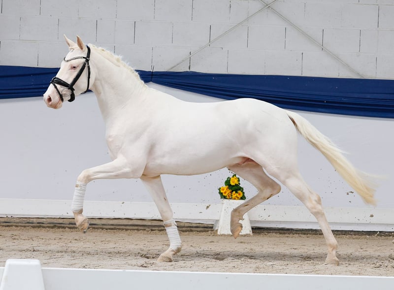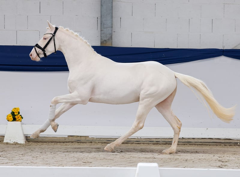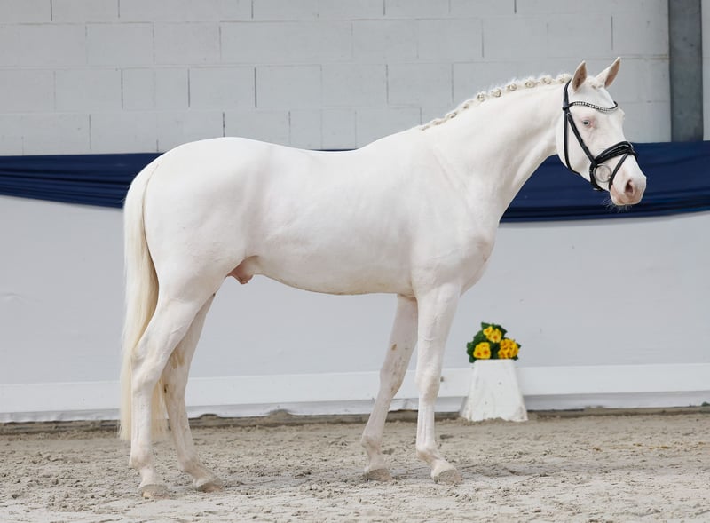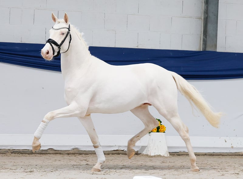 In unserer Kollektion stehen streng selektierte Youngster f�r alle Anspr�che: Ausbildungs-, Zucht- und Kinderponys Hier gelangen Sie zur Gesamtkollektion: https://ponyforum.auction Ein weiterer gekörter Hengst steht mit dem Cremello EMR Gamarelli im Lot. Der Junghengst wurde im vergangenen Herbst vom Bayerischen Zuchtverband gekört und konnte seine hervorragende Bewegungsqualität und seine positive Präsenz bei seiner Körung erfolgreich in Szene setzen, Gamarelli ist ein wirklich umgänglicher Junghengst, der sehr kooperativ mit seinem Menschen zusammenarbeitet und alles richtig machen möchte. Sein Vater Thuraus Giotto war selbst erfolgreich im Dressursport und konnte mehrfach am Bundeschampionat teilnehmen. Und auch Gamarellis Mutter CTS Fair Lady war vor ihrer Zuchtkarriere hocherfolgreich im Dressurport! Sie gewann Dressurprüfungen bis zur Klasse L** und wurde neben der Staatsprämienauszeichnung ebenfalls als Leistungsstute ausgezeichnet. Ein vielversprechendes Nachwuchspony mit bester Genetik, Qualität und Interieur! Direkt vom Züchter.