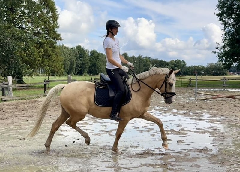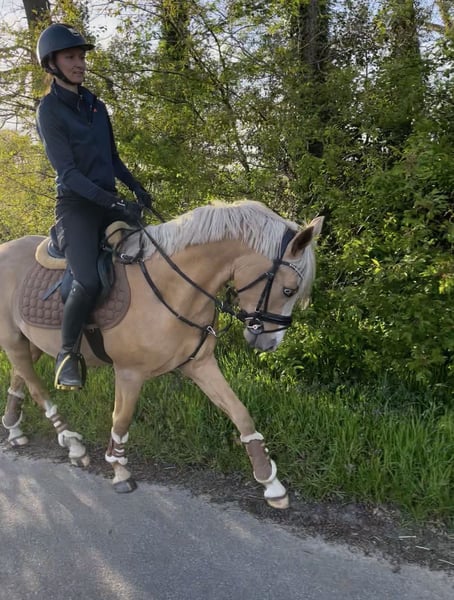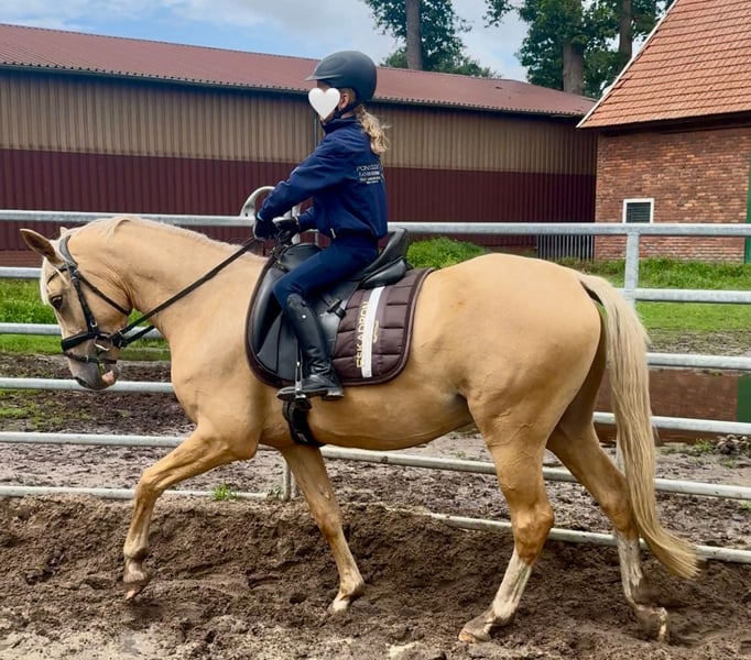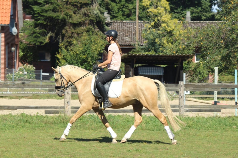 Dieser absolut unerschrockene und charmante Palominowallach hat ein Herz aus Gold und sucht ein neuen Möhrchengeber. Er ist mit sehr guten Grundgangarten ausgestattet, macht auch schon einen kleinen Sprung und geht sogar schon mit seinen 4 Jahren mutig voran ins Gelände. Ein 10-jähriges Mädchen konnte bereits auf ihm Platz nehmen. Allerdings aufgrund des Alters kein reines Kinderpony. Eine gute AKU und ein kompletter TÜV ohne Befunde liegen vor, aufgrund eines Mangels weit unter Wert abzugeben. Platz vor Preis. Er hat echt eine Seele aus Gold