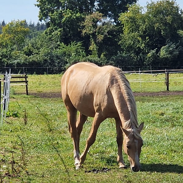 Wir geben unseren braven und anhänglichen Reitponyhengst in gute Hände ab. Er ist 3 Jahre alt, geschätztes Endmaß, Palomino mit weißen Abzeichen und absolut hübsch. Er ist sehr umgänglich und lebt momentan noch in einer gemischten Hengst / Wallach-Herde. Dort zeigt er sich sehr verträglich. Er ist sehr anhänglich, liebt Streicheleinheiten, ist brav beim Hufschmied und kennt das Verladen in einen Pferdeanhänger. Er zeigt sich bislang sehr kooperativ und möchte alles richtig machen, ist sehr gut händelbar und umgänglich. Wir denken, dass er sich für Dressur, Springen und auch das Gelände gut eignen wird, da er sehr unerschrocken, mutig und sehr nervenstark ist. Vom Charakter her ähnelt er sehr seiner Vollschwester, die in der Dressur der Klasse L sehr erfolgreich ist, wie auch im Springen der Klasse E (Möglichkeit für mehr, aber nicht weiter gefördert) und als verlässliches Therapiepferd. In seinen Pedigree führt er den berühmten Hengst Deinhard B. Bei weiteren Fragen stehen wir gerne unter 0173-1808020 zur Verfügung.