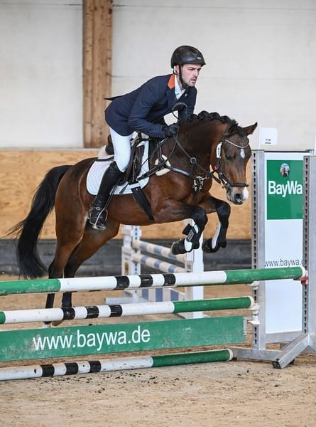 Der gekörte Hengst Bumble Bee ist der letzte Sohn des höchst erfolgreichen und braven Hengstes Beka`s Rubin, ein Welsh B. Andere Nachkommen von Beka´s Rubin sind in Dressur, Springen und Distanzreiten platziert. (z. B. Beka´s Ramazotti bis S-Dressur siegreich). Vierjährig wurde Bumble Bee angeritten und auf die Hengstkörung vorbereitet. Von 2023 bis Juli 2025 war er in Beritt und wurde von seiner Reiterin Anna Unger (15 J, Schwabenkader) auf Turnier vorgestellt. Zuletzt war er bis A-Springen ** siegreich und in L-Springen (fehlerfrei) platziert. Potential, Bereitschaft und Spaß am Springen sind in hohem Maße vorhanden. Sein Charakter ist kaum zu übertreffen. Leistungsbereit und ehrlich gibt er für seinen Reiter alles. Genauso wie der Vater ist er ein absolutes Kinderpony, somit auch von jugendlichen Reitern mit entsprechender Ausbildung toll zu händeln. Hänger fahren, Hufschmied, Reiten im Gelände usw. - der Hengst ist hochanständig, sehr umgänglich und einfach nur liebenswert. Außerdem ist er nervenstark und unerschrocken. Er hat kein Problem mit anderen Tieren, Straßenverkehr, Wasser, laute Geräusche usw. Er ist kerngesund. Mängel, Allergien, Unverträglichkeiten etc. sind nicht bekannt. Im November 2024 hat Bumble Bee in München-Riem im 30-Tage-Test seine Hengstleistungsprüfung mit Endnote 8,33 absolviert. Röntgenbilder / TÜV einwandfrei. Ab sofort steht er gesunden Stuten im Natursprung zur Verfügung. Mit seinen schicken Abzeichen hat er hohen Wiedererkennungswert. Aufstallung möglich. Weitere Auskünfte gern vorab telefonisch unter Handy: 0177 / 357 33 87.