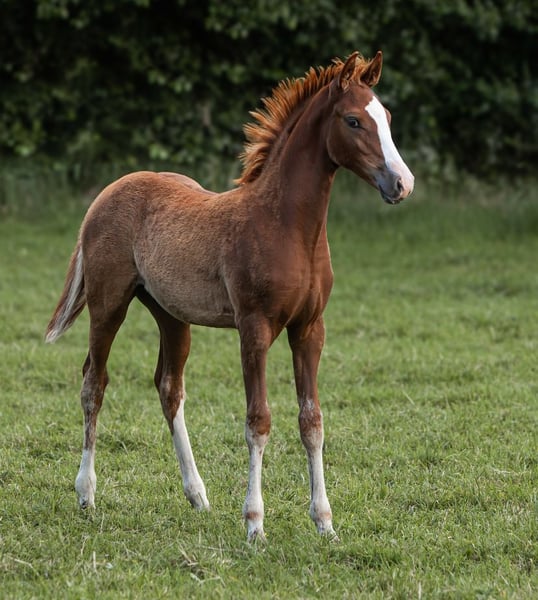 Zwickel is a colt from the special stallion Zauberlehrling. He is correctly built, with excellent basic gaits, awarded with a foal premium. The maternal grandfather is successful in dressage at the S level. The grandmother was successful in show jumping up to the M level. Zwickel is growing up in a small family breeding operation by the Baltic Sea under the best conditions.