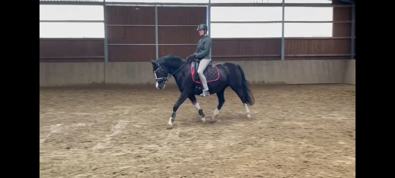 After careful consideration, I am looking for the right person for this beautiful black mare. Charisma is 10 years old and has been with me since weaned. She had a top-quality foal, has been on camping holidays with me, and is trained up to A-level dressage. Due to my full-time job and caring for two other ponies on my own, I need to part with one pony. She is simply too precious to spend most of her time standing around. Although she does everything with me—dressage, jumping, ground work, hacking alone and with a partner, competitions—she is not a pony for everyone! Sometimes she is very cool and can confidently navigate unfamiliar terrain for two hours, even for a 75-year-old rider. Other times, she can be spooky and easily startled. Therefore, a rider with plenty of experience and a secure seat is essential. She is happy to stay in her box at night and in the open stable during the day. In summer, she is on pasture 24/7. She is barefoot and can also be ridden in hoof boots when needed. Ideally, I am looking for an adult person who wants to continue her education without overwhelming her. She works very willingly and wants to do everything correctly. Although she is a XXL pony with a strong build, she is definitely NOT a load carrier. (She is well covered; I am 1.77 m tall.) Loading, hoof care, and handling are all easy with her. If you have enough horse experience, please get in touch. We can discuss everything further over the phone. Pedigree: From PAV Nutrix (Nemax x Benetton S), out of Zöthens Carina (Nitendo x Koyano x Ergano) Please contact me preferably via WhatsApp: 0174 4468951 Kerstin Lütge P.S.: SPACE BEFORE PRICE!