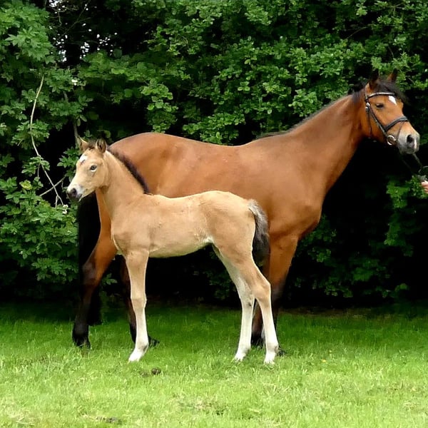 Wir suchen ein neues Zuhause für unsere Deutsche Reitponystute (*2013) von Olivier K x FS Champion de Luxe (Top Nonstop). Die Stute ist Halbschwester zu Dimensional H. Sie wurde in jungen Jahren angeritten und war in Reitpferdeprüfungen mehrfach hoch platziert. In den letzten Jahren wurde sie ausschließlich in der Zucht eingesetzt. Alle Geburten bei uns (bisher 5) hat die Stute alleine gemeistert und sie verliefen absolut komplikationslos, genau wie die anschließende Versorgung und Aufzucht des Fohlens. Sie hat mit verschiedenen Hengsten mehrere weibliche Nachkommen (1. und 2. Generation), die die Elitestutenprämie erhalten haben. Eine Tochter war sogar Endringstute auf der Westfalen Woche. Mehrere Nachkommen befinden sich noch in unserem Besitz und können vor Ort besichtigt werden. Die Stute wurde regelmäßig entwurmt, geimpft und dem Hufschmied vorgestellt. Sie hat ein Stockmaß von 1,46m. Aktuell ist die Stute für 06/2026 tragend von Diamantino Gold. Das Fohlen kann mit übernommen werden oder nach dem Absetzen zurückgegeben werden. Auch wäre es möglich, dass die Stute noch bei uns auf dem Hof stehen bleibt. Der Preis ist für die Stute und verhandelbar. Wenn das Fohlen übernommen wird, müssten wir uns auf einen neuen Preis einigen. Bei Fragen melden Sie sich gerne. Auch können wir einen Termin vor Ort vereinbaren. Videos werden nicht verschickt.