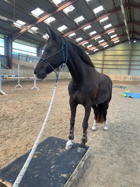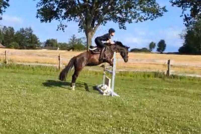 Lady is a 12-year-old German Riding Pony mare suitable for the recreational rider with a sporting ambition. Ideally, she requires a small, light, experienced adult rider with a consistent yet calm demeanor. Currently, she is also regularly ridden weekly by a 13-year-old girl in lessons, and she remains well-behaved. Her daily routine includes dressage, jumping, hacking, and individual ground work, all of which she approaches with enthusiasm. Variety is very important to her. She lives in a box with paddock access; in summer, she spends her days on pasture, and in winter, she is turned out on a sand paddock for half a day. Since the beginning of the year, she has been barefoot thanks to professional hoof care. I have been riding her weekly in private lessons. During holidays, she has been ridden under saddle by a professional rider. German Riding Pony mare Color: Dark Chestnut Date of Birth: 2013 Height: 146 cm (approx. 14.1 hh) Sire: Halloween Dam: Resi Dam's Sire: Magnum Price: €12,500 negotiable, including a custom-made jumping and dressage saddle from Selleria Equipe, recently fitted this year. Regularly vaccinated, dewormed, and dental checked.