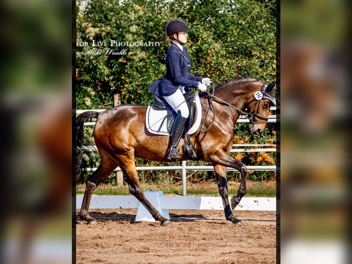 Panamera is a 13-year-old mare by Strahlemann out of Galileo/ Constantin, with a height of 154 cm (measured as an end-size pony at 148 cm). We have owned her since February 2019, having purchased her directly from the breeder. The pony has no vices whatsoever. She possesses above-average movement and an impressive presence with plenty of expression. She is the perfect partner for advanced dressage, eventing, or show jumping. Due to her size, she is ideally suited for both young, emerging riders and more experienced equestrians. Panamera has been regularly presented at riding days and competitions, achieving multiple wins in dressage up to A* level and placements in A** classes. During winter training, she has been prepared with dressage exercises at L-level and is fully ready for the upcoming competition season. In jumping, she has been competed at E-level with successful placements. In training, she has jumped up to A-level but could benefit from further development in this discipline. She clearly enjoys jumping, which makes a sport career in show jumping or eventing very feasible. The pony has already participated in cross-country training sessions with her rider, which she thoroughly enjoys. In handling, Panamera is well-mannered, friendly, and very affectionate due to her people-oriented nature. In the herd and stable, she is approachable and curious towards other horses and humans. She is the dominant mare in her herd. Currently, Panamera spends her days on pasture in a mixed herd and stays in her box at night. She is shod, load-trained, and very well-behaved during veterinary visits (vaccinations and teeth checks). She is four-hoofed and has been regularly vaccinated and dewormed. Her teeth are checked as needed (at most every two years). She has always been in excellent health with no prior illnesses. Panamera has previously foaled a foal, which she delivered and cared for without any issues. Panamera is a pony with a big heart. We are therefore seeking a new, 5-star home where she can ideally find her final place. The mare is not available as a school horse or to dealers. Price is secondary to finding the right home. This is not an emergency sale. If you are looking for a reliable and talented partner with whom to achieve shared success, please contact us to arrange a viewing and trial ride. A trial ride costs €35, which will be deducted from the purchase price. Please feel free to contact me for further information.
