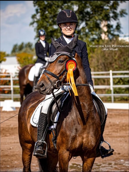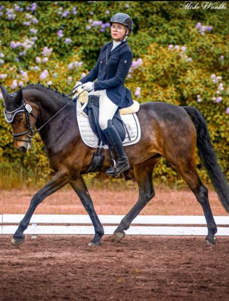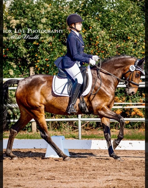 Panamera è una cavalla di 13 anni, figlia di Strahlemann / Galileo / Constantin, con un'altezza al garrese di 154 cm (misurata come pony di altezza finale con 148 cm). È con noi dal febbraio 2019, acquistata direttamente dal allevatore. La cavalla non presenta alcuna cattiva abitudine. Ha movimenti sopra la media e una presenza imponente, con molto espressività. È la partner ideale sia per l'alta disciplina del dressage, sia per il concorso completo o il salto ostacoli. Grazie alla sua altezza, è perfetta sia per giovani cavalieri in crescita sia per cavalieri più esperti. Panamera è stata regolarmente presentata in gare e manifestazioni di salto e dressage, ottenendo numerose vittorie fino a livello A* e piazzamenti fino a livello A**. Durante il lavoro invernale, è stata preparata in esercizi di dressage di livello L ed è quindi pronta per la prossima stagione agonistica. In salto, è stata presentata a livello E e si è anche piazzata. In allenamento, è stata saltata fino al livello A, anche se potrebbe beneficiare di ulteriori stimoli in questa disciplina. Mostra evidente entusiasmo anche per il salto, rendendo possibile una carriera sportiva anche nel salto ostacoli o nel concorso completo. La cavalla ha già partecipato più volte a training di campagna con la sua amazzone, affrontandoli con grande entusiasmo. Nel rapporto con le persone, Panamera si mostra mansueta, socievole e molto affettuosa, grazie al suo carattere molto amante degli umani. In paddock e nel box, si dimostra socievole e curiosa sia con altri cavalli sia con le persone. È dominante nel branco. Attualmente, Panamera passa il giorno nel paddock misto e la notte nel box. È molto brava a farla ferratura e al carico, e si comporta con grande calma durante visite veterinarie (vaccinazioni e controlli dentali). È dotata di quattro scarpe, è stata regolarmente vaccinata e sverminata. I suoi denti sono stati controllati e limati secondo necessità (al massimo ogni due anni). Finora, la cavalla è sempre stata in perfetta salute e non ha mai avuto problemi di alcun tipo. Panamera ha già avuto un puledro, che ha partorito senza problemi e con grande cura. Panamera è una cavalla dal grande cuore. Per questo motivo, cerchiamo per lei una nuova casa 5* in cui possa trovare il suo posto definitivo. La cavalla non viene venduta come cavallo da scuola né a commercianti. Priorità alla qualità, non al prezzo. Questa non è una vendita urgente. Se cercate una partner affidabile e talentuosa, con cui condividere successi, non esitate a contattarci per una visita e un test ride. Per un test ride, sono previsti costi di 35 EUR, che verranno scalati dal prezzo di acquisto. Per ulteriori informazioni, sono a vostra disposizione.