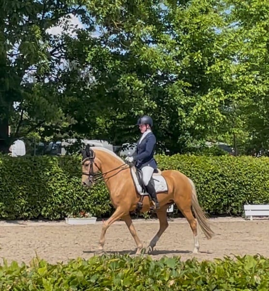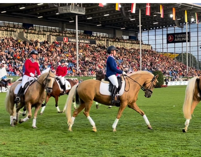 With a heavy heart, we are offering our pony princess for sale. She is a German Riding Pony mare – Palomino, born in 2011, and was bred from the stallion Don’t Worry and Arts-Dancer Boy. Not only is she a real eye-catcher in appearance, but despite her height of 146 cm, she covers very well in the stallion type, and we are often asked if she still meets the size requirements. Our Mary is a true prize winner, an excellent teacher, and a reliable partner in all aspects of life. She loads independently onto trailers and transporters, and she comfortably stands for the farrier and clipping. She knows how to present herself confidently at competitions. She has achieved success at L* level, mostly against larger horses, and has been placed high in L** classes – there is certainly potential for further development here. She is a secure L** level lesson horse and is easy to handle even for smaller, less experienced riders. She has been district champion and winner of the Volksbank Cup, among other accomplishments. Mary has a very sweet nature and truly is a princess. She is open to almost any kind of fun, loves swimming, enjoys hacks, and likes jumping – although we have not actively promoted her in this discipline. As a member of the Lower Saxony Pony Quadrille, she has participated confidently in several major events, including the CHIO Aachen opening ceremony (on the famous grass arena), the Hamburg Derby, the Horse & Hunt, and many others. She has never been ill with us and has never been in a bad mood. We are not in a hurry to sell her and will only part with her if we find a truly wonderful princess home for her. If you are genuinely interested, please contact us via WhatsApp at 016097233628.