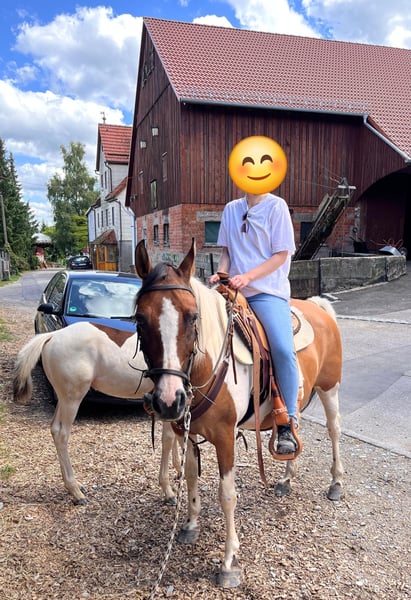 Absoluter Ausnahmeverkauf: Nach langer Überlegung haben wir uns entschlossen unsere 14-jährige Scheckstute "Romy" (im Pass "Ramona") zu verkaufen *27.05.2011 Stm: 149cm Mutter: Dt. Reitpony "Darinka" (fuchs) Mutter-Vater: der erfolgreiche Dt. Reitponyhengst - Don't Worry (fuchs) Vater: Lewitzerhengst "Romeo" --> Abstamung s. Bilder Romy ist eine ausdrucksstarke Dt. Reitponystute mit wundervoller, besonderer Braunscheckung. Sie ist seit 2019 in unserem Besitz. Romy ist eine tolle Zuchtstute und gute Mutter und hat uns hier problemlos 4 wunderbare Quarter-Pony Fohlen geboren. Aus diesem Grund dürften wir sie eigentlich nicht verkaufen. Aber Romy ist eben auch sehr fein ausgebildet und sehr menschenbezogen. Ich habe den Eindruck sie möchte mehr als "nur" eine Zuchtstute sein. Leider fehlt uns hier die Zeit für sie. Und es ist schade, dieses sensible Pferd so selten zu reiten bzw. mit ihr am Boden zu arbeiten. Was beider viel Spaß macht mit ihr. Deshalb haben wir sie dieses Jahr nicht mehr belegt. Romy hat auf den Bilder zwar einen Westernsattel an, weil dieser gut passt, ist aber klassisch ausgebildet! Durch ihre Lewitzer-Abstammung ist sie natürlich blütig und hat Go. Man muss sie also nicht treiben, dennoch lässt sie sich gut händeln, reagiert direkt auf feine Hilfen. Ich reite sie im Gelände gebisslos. Obwohl sie mit unseren Grauvieh-Kühen ab und zu zusammen auf der Weide steht, reagiert sie manchmal ängstlich auf Fleckvieh-Kühe im Gelände. Das ist aber auch schon das einzige Manko, was ich von Anfang an bei ihr beobachte... Mit etwas Training wird sich aber auch das vermutlich verflüchtigen. Aktuell hat sie noch "Finest Rocco" ein Quarter-Pony Scheckhengst (Vater: QH "EH one of Lena's Finest) bei Fuß. Er ist am 06.06.2025 geboren. Daher kann Romy unseren Hof frühestens im Januar 2026 verlassen. Falls jemand eine Stute inkl. Hengst-Fohlen sucht, wäre das natürlich auch möglich. Zusammen könnten wir die beiden ab sofort abgeben. Das äußerst gelungene QP Henstfohlen "Finest Rocco" wird beim ZSSE e.V. eingetragen, gechipt, entwurmt und Tet. geimpft abgegeben. Hierbei handelt es sich um eine seltene Gelegenheit. Von unserem Hof werden meistens nur Jungpferde abgegeben. Für beide kommt nur ein artgerechtes neues Zuhause und gefühlvolle Reiter in Frage. Wir freuen uns, wenn beide zusammen einen neuen Platz finden und würden hier auf 7T. entgegen kommen. Einzeln kostet Romy 5.500€ VB und Rocco 3.000€. Bei uns gilt immer: Desto artgerechter der zukünftige Platz, desto größer die Verhandlungsbereitschaft. Und Preisverhandlungen führe ich nur vor Ort! Für Fragen zur Romy und Rocco bzw. Terminvereinbarungen über Besichtigungen freu ich mich über nette Nachrichten...