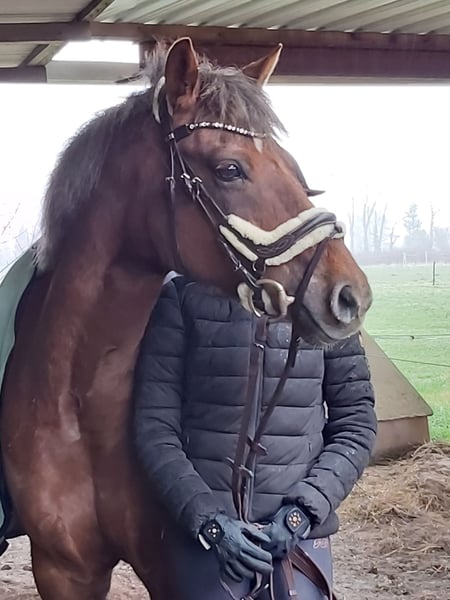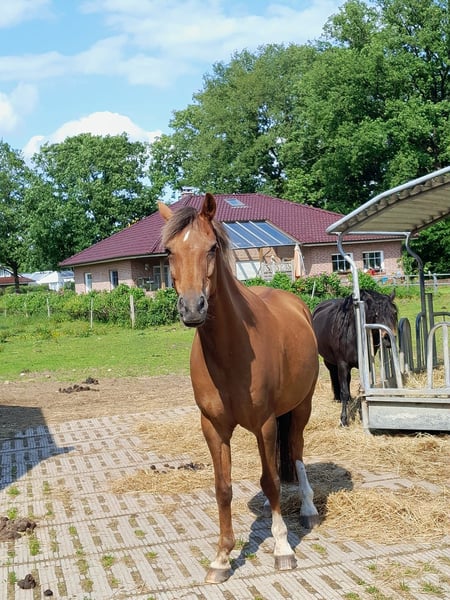 Fast 18 jährige dt. Reitponystute, Fuchs in schicker Optik aus persönlichen Gründen abzugeben. Bedingt Reitbar, tolles Bodenarbeitspony oder als Beistellpferd mit Ansprache. Volles Papier, Sie ca. 148cm STM. wurde von 12 und 16 jähriger regelmäßig geritten. Nahm am Unterricht und Dressurlehrgängen teil. (bis Ende 2024) Sie möchte gefallen umd möchte alles richtig machen. Sie hat gute Grundtempi und lässt sich gut arbeiten. Sie möchte beschäftigt werden und auch gefordert werden. Die Blau/Gelbe Welt der Dualaktivierung und Equikinetic ist ihr bereits bekannt. Lässt sich gut und einfach longieren, hört gut zu. Sie geht auch gern spazieren, kennt Kinder, Trecker, Autos, Hunde etc. Sie arbeitet gern und möchte alles richtig machen. Auch Doppellonge mit Lehrgang haben wir gemacht und bereiten ihr Spaß. Sie benötigt eine einfühlsame Hand und dennoch klare Ansagen. Am liebsten fragt sie nach „Kecksen“. So süß wie sie ist, muss man ihr auch ihre Grenzen aufzeigen. Sie geht mit vertrauten Personen auch alleine ins Gelände. Sie hat hinten rechts im Krongelenk Arthrose sowie eine Fehlstellung. Mit alubeschlag+Gummiplatte ist das zu korrigieren, sie nimmt es gut an. Sie darf belastet und geritten werden, wird jedoch nicht mehr 100% taktrein laufen und ggfls. kürzer treten. Zudem ist sie bei kalten Temperaturen steif und brauch ihre aufwärmphase. Sie arbeitet beim longieren und vom Boden gut mit. Das macht ihr Spaß. Sie möchte auch noch beschäftigt werden und nicht aufs Abstellgleis. Ihre arbeitsmoral ist tagesform abhängig. Darauf sollte man sich einstellen können und wollen! Probereiten nicht möglich da erst wieder am antrainieren! Tuniere definitiv nicht mehr möglich, was insgesamt geht, kann ich und auch kein anderer sagen und beurteilen. Mangels aktuellem Reiter wird Sie bei uns derzeit nur am Boden gearbeitet. Das Go zum starten ist vorhanden unter Berücksichtigung der aktuellen Tagesform. Stehen aktuell noch in der Klinik zur Reha (aquatrainer/bodenarbeit) und wechselt zu März in Pensionsstall. Gern an jemanden der nicht oder nur wenig reiten möchte und Gesellschaft / Bodenarbeitspartner sucht. Sie ist ein ein bis zwei Personen Pferd, benötigt in neuer Umgebung Zeit um sich einzugewöhnen und vertrauen zu fassen. Sie ist eine "typische Stute", manchmal zickig manchmal ganz lieb aber nie böse. Zur Haltung Nur in reine Stutenherden. Sie ist rangniedrig und muss in Ruhe fressen können. Nachts ist sie gern drin und für sich. Keine Abgabe in Offenstall! Optimal wäre paddockbox mit täglich freigang. Im Sommer keine 24/7 weide. Aufgrund der fehlstellung und Arthrose muss das Gewicht niedrig bleiben! Sie ist aktuell gegen Tetanus Influenza und Herpes geimpft Hinten alueisen+gummiplatte / vorne unbeschlagen Sie ist nur bedingt verladefromm, das müsste man wieder üben. Sie brauch Zeit und überredung. Lt. Vorbesitzerin ist Sie Heu/Strohstaub anfällig. Aktuell steht sie bei uns in einer Paddockbox auf Stroh mit Heu. Jeweils gute Qualität ohne Auffälligkeiten. Sie wird ohne Zubehör abgegeben! Preis bei entsprechendem Platz vor Preis