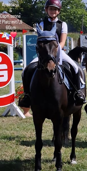Capri Sonne ist ein gut ausgebildetes, zuverlässiges Kinderpony mit Turniererfahrung. Sie zeigt sich stets brav, rittig und konzentriert – sowohl im täglichen Training als auch im Turniereinsatz. Sie ist springfreudig und sicher unter dem Sattel. Mit ihr wurde aktuell erfolgreich das Reitabzeichen 5 abgelegt. In der Vergangenheit startete sie bis zur Klasse A** im Springen sowie Klasse A in der Dressur. Aufgrund ihres Charakters, ihrer Ausbildung und ihrer Erfahrung ist Capri Sonne das ideale Pony für Kinder. Kontakt nur per Anruf