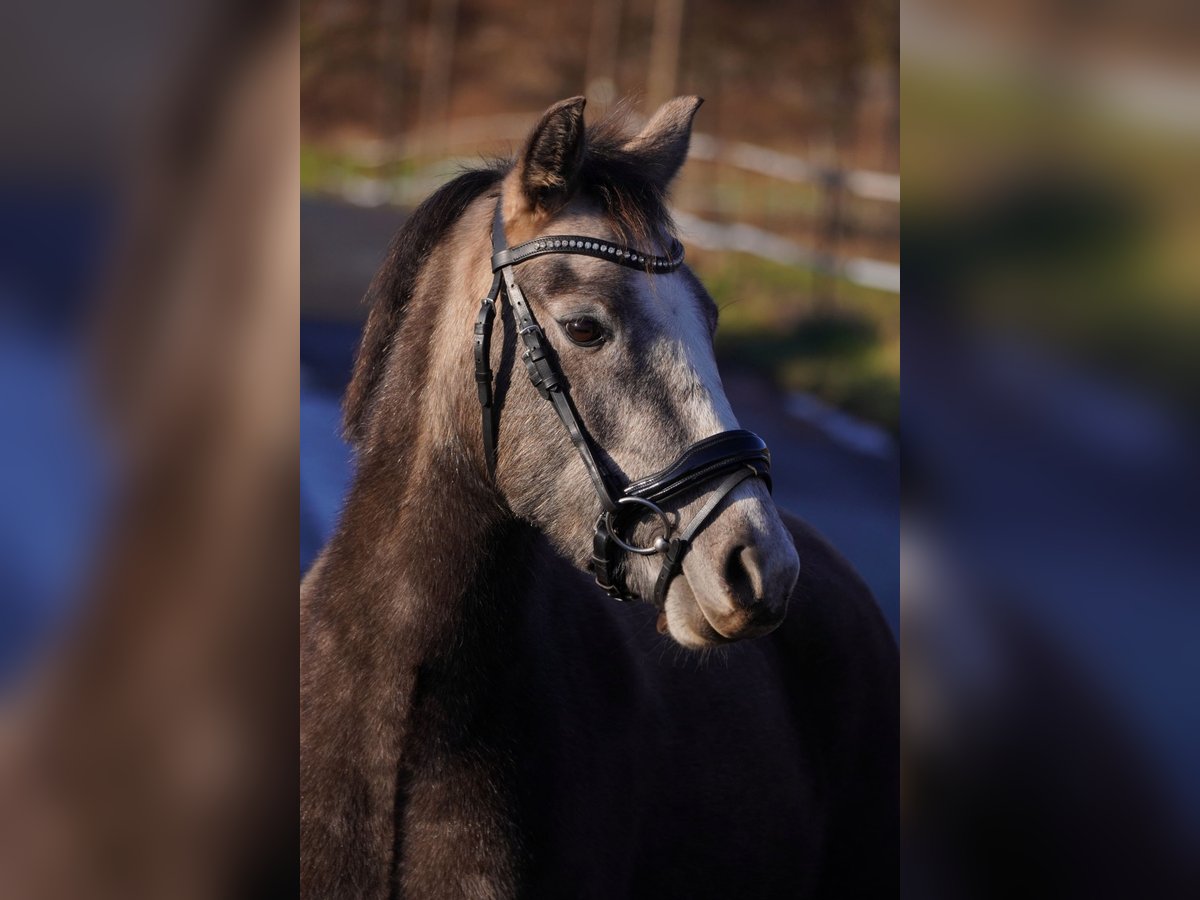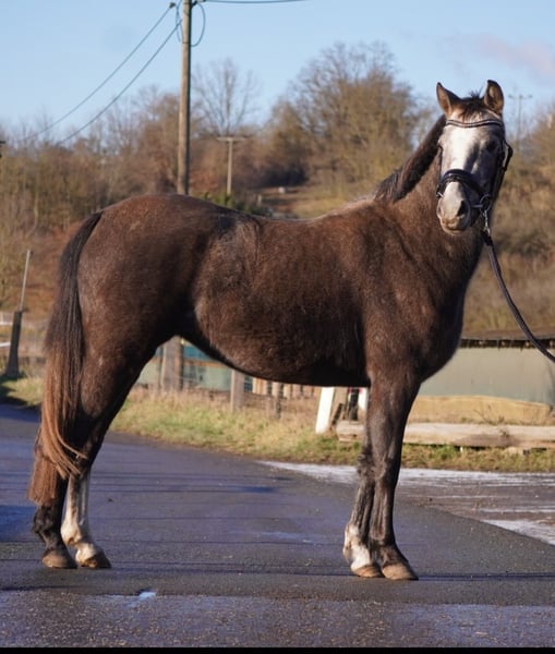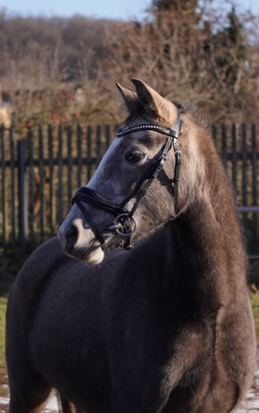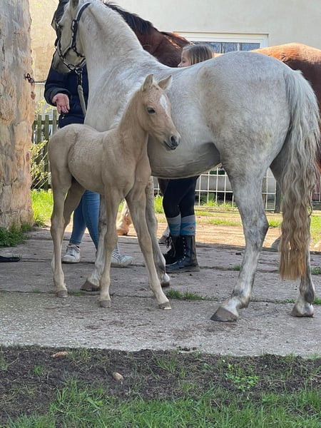 On behalf of a friend, a German Riding Pony mare born in 2023 is being offered. She is currently 135 cm tall and grey in color. This charming German Riding Pony mare was foaled in 2023 and impresses with her friendly nature and her lovely appearance. She is a daughter of the Welsh Pardbret mare Trinket, who is used as a children's and youth pony in leisure riding and also competes with her rider in WBO competitions. She can be seen in the last photos. She is paired with the well-built Riding Pony stallion Grand Coeur, who also impresses with his rideability and calm demeanor. She was raised in a small, mixed-age herd in private ownership with a family background. As a foal, she was awarded 24 points in her licensing. Her estimated final height is around 1.40 m. She has received regular vaccinations and deworming treatments. Total Gold has a pleasant temperament and is very well-behaved in handling. She has been lunged and tested in free jumping. She also proves to be very manageable in unfamiliar environments and loads easily by herself. Ideal for pony enthusiasts seeking a reliable and lovable leisure pony for self-education and training. For more information, questions, and videos, please feel free to contact me.