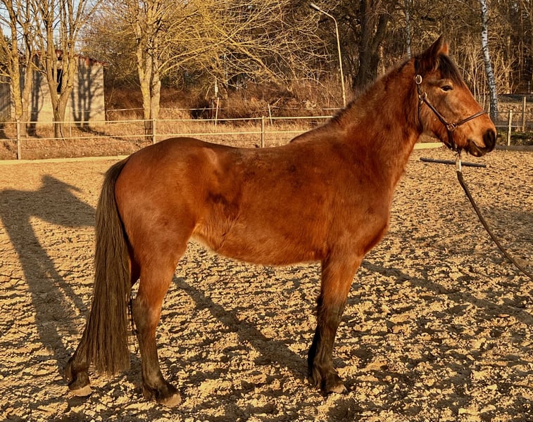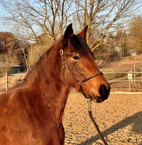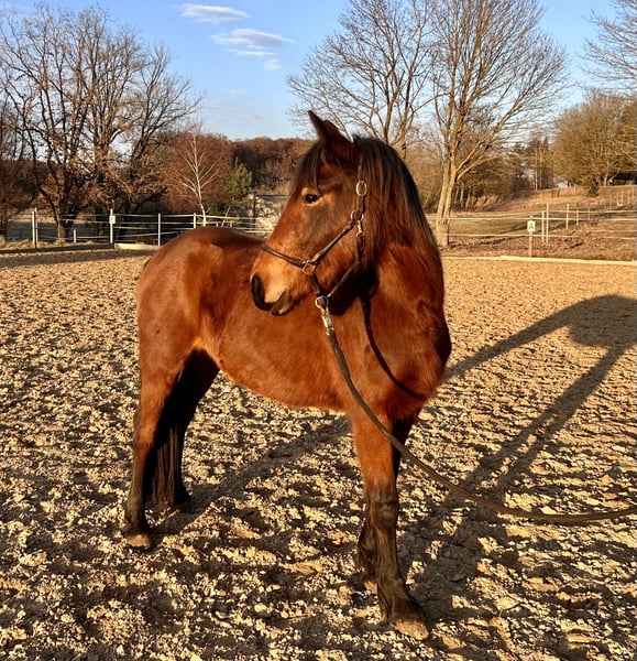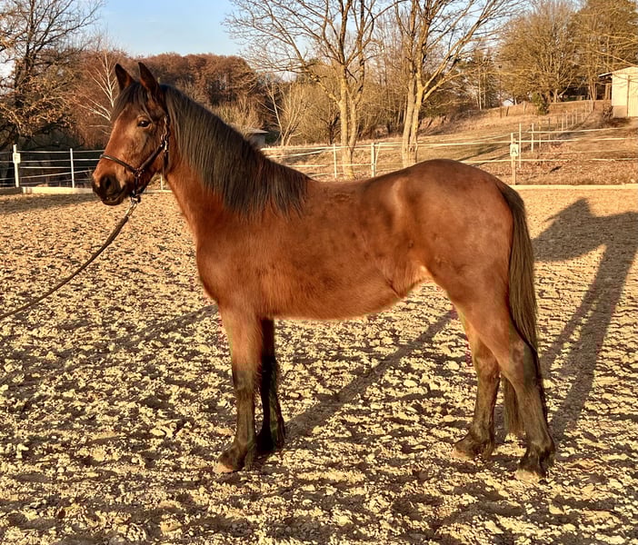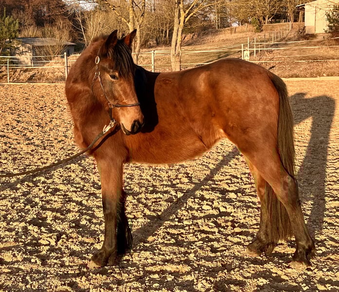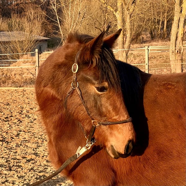 Zum Verkauf steht eine vielversprechende Jungstute, geboren im Jahr 2023, mit einem aktuellen Stockmaß von ca. 1,40 m. Die junge Stute ist aufgeschlossen, neugierig und sehr menschenbezogen. Im täglichen Umgang zeigt sie sich brav und lernwillig. Führen sowie Hufe geben kennt sie bereits und macht dies zuverlässig. Außerdem hat sie bereits erste Basiserfahrungen im Natural Horsemanship sammeln dürfen und wurde spielerisch an die Grundlagen herangeführt. Dabei zeigt sie sich aufmerksam, kooperativ und lernfreudig.