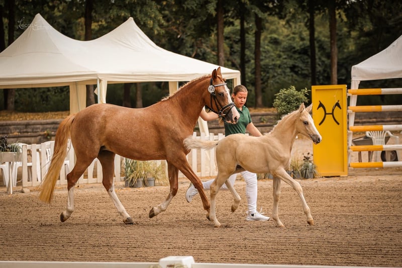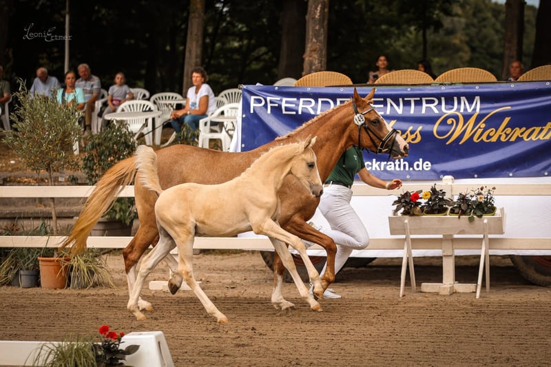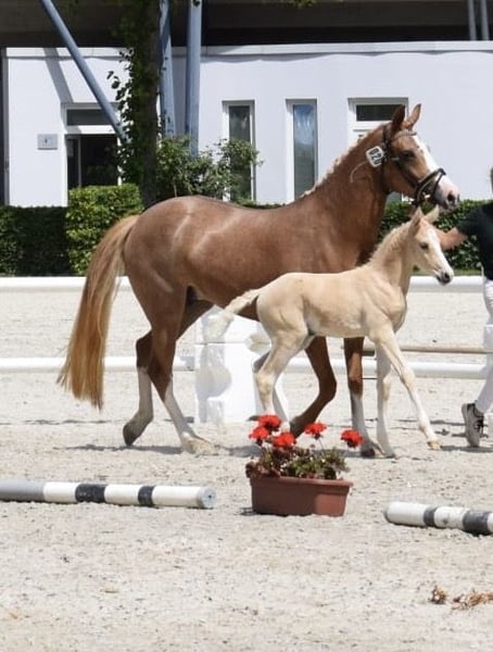 We offer our four-year-old state premium mare "Dating's Dilanka" with an excellent pedigree (Dating AT NRW x FS Champion de Luxe), in foal for 2026 to "D-Gold AT NRW" and with a prize-winning, very typy, expressive colt at foot, with outstanding movement potential (also by the top stallion and successful Bundeschampion "D-Gold AT NRW"). Dating's Dilanka is exceptionally calm, absolutely clear-minded, very intelligent, and highly willing to learn. A unique opportunity for breeders who value quality, proven bloodlines, and future prospects. A comprehensive future-oriented package for connoisseurs with quality that convinces. For questions or interest, please call. Tel.: 024565060725. No emails, please!