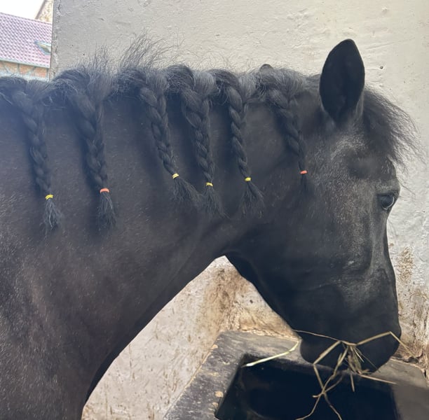 Zum Verkauf steht eine hübsche, fast 4 jährige Stute in Sonderlackierung (schwarz mit weißem Stichelhaar) mit beidseitiger Mähne, Stockmass zur Zeit 147 cm. Sie ist vom Boden aus gearbeitet, wird regelmäßig longiert, auch an der Doppellonge, und ist angeritten in allen drei GGA wobei ihr der Galopp noch schwer fällt. Bei der Arbeit zeigt sie sich unerschrocken und lernt schnell. Es liegen aktuelle Röntgenbilder, ohne Befund, von Rücken und Beinen vor. Sie ist durchgeimpft und frisch entwurmt. Sie hat holländische Papiere ohne Abstammungsnachweis. Eine junge Stute mit Perspektive für Reiter, die sich im Freizeitbereich eine zuverlässige Partnerin aufbauen möchten. Wir wünschen uns für Sie ein liebevolles Für-Immer-zu Hause. Kein Verkauf an Händler oder Reitschulen!